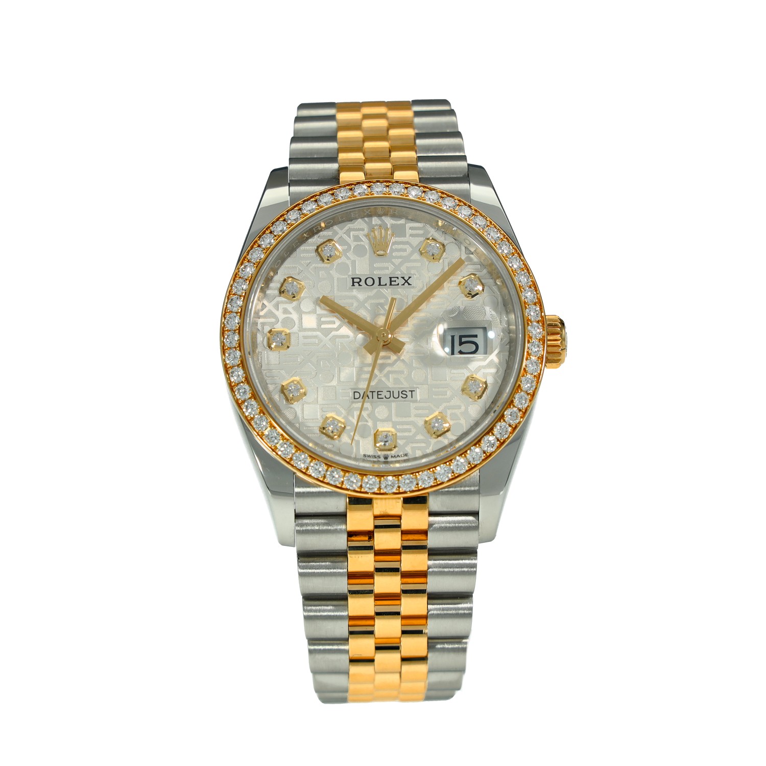 This Rolex Datejust 126283 RBR has a silver jubilee diamond dial and a bracelet strap. This Rolex has undergone a thorough inspection of water resistance, accuracy, functionality and condition to determine the level of reconditioning required to meet our strict standards. It has also been referenced against technical documents and manufacturer records where available to ensure authenticity and a clean history. All our watches have a 24-month warranty for your peace of mind. One of our skilled polishing technicians has removed marks on the case and bracelet of this watch, brought about by daily wear and tear, which is why this watch does not come with the remaining manufacturer’s warranty.