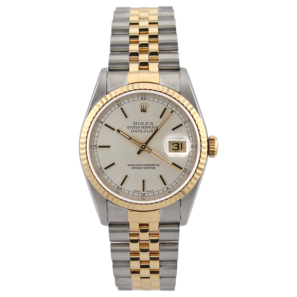 This Rolex Datejust 16233 has a silver baton dial and a bracelet strap. This Rolex has undergone a thorough inspection of water resistance, accuracy, functionality and condition to determine the level of reconditioning required to meet our strict standards. It has also been referenced against technical documents and manufacturer records where available to ensure authenticity and a clean history. All our watches have a 24-month warranty for your peace of mind. One of our skilled polishing technicians has removed marks on the case and bracelet of this watch, brought about by daily wear and tear, which is why this watch does not come with the remaining manufacturer’s warranty.