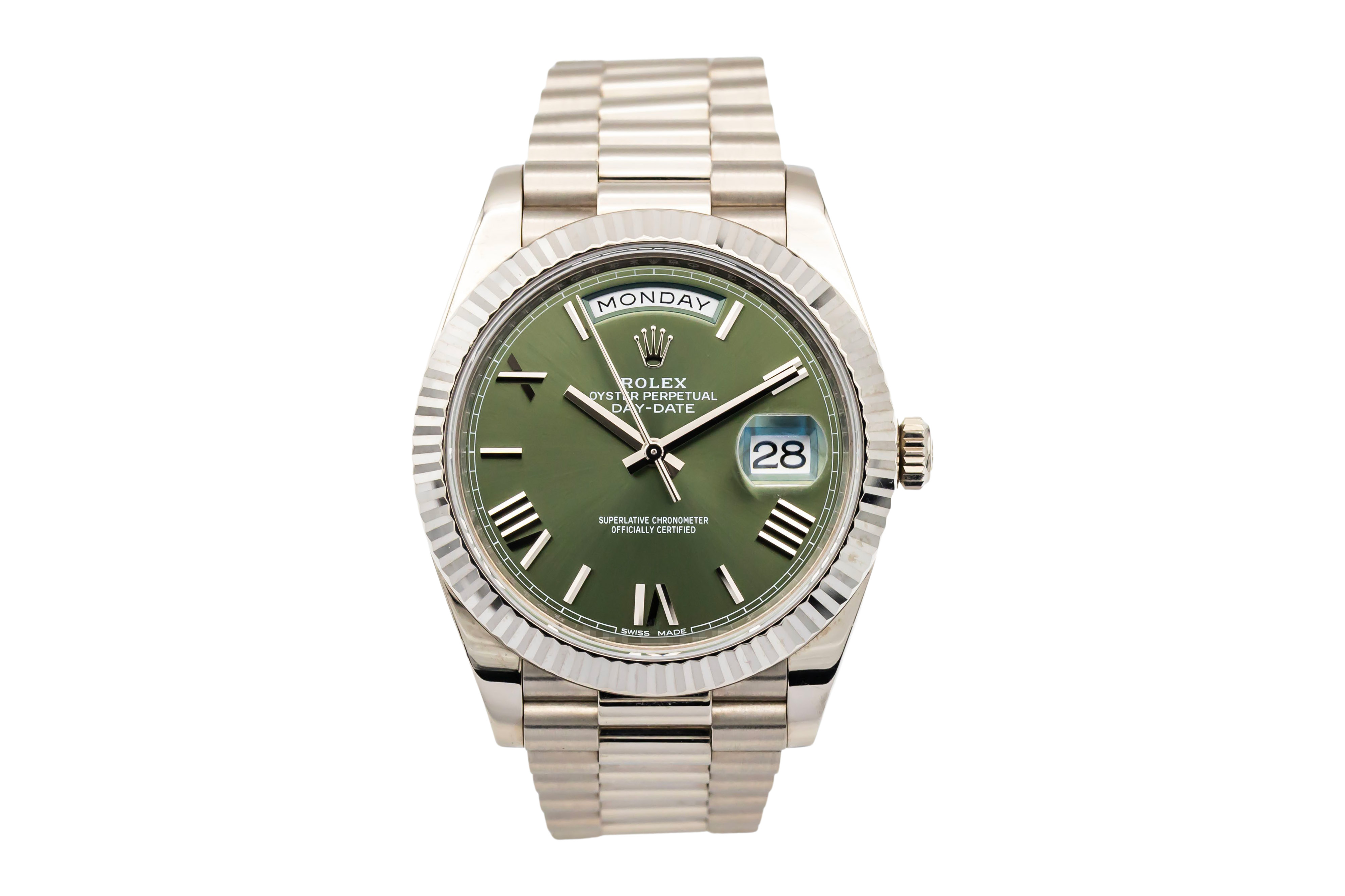 This Rolex Day-Date 40 228239 has a olive green roman numeral dial and a bracelet strap. This Rolex has undergone a thorough inspection of water resistance, accuracy, functionality and condition to determine the level of reconditioning required to meet our strict standards. It has also been referenced against technical documents and manufacturer records where available to ensure authenticity and a clean history. All our watches have a 24-month warranty for your peace of mind. One of our skilled polishing technicians has removed marks on the case and bracelet of this watch, brought about by daily wear and tear, which is why this watch does not come with the remaining manufacturer’s warranty.