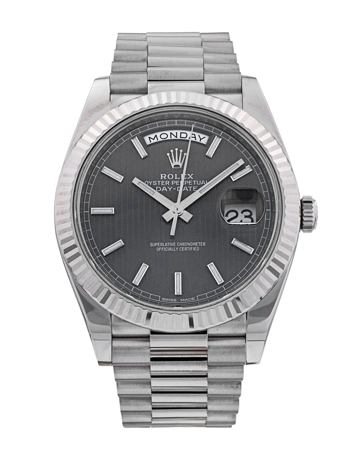 This Rolex Day-Date 40 228239 has a dark rhodium, stripe motif dial and a bracelet strap. This Rolex has undergone a thorough inspection of water resistance, accuracy, functionality and condition to determine the level of reconditioning required to meet our strict standards. It has also been referenced against technical documents and manufacturer records where available to ensure authenticity and a clean history. All our watches have a 24-month warranty for your peace of mind. One of our skilled polishing technicians has removed marks on the case and bracelet of this watch, brought about by daily wear and tear, which is why this watch does not come with the remaining manufacturer’s warranty.
