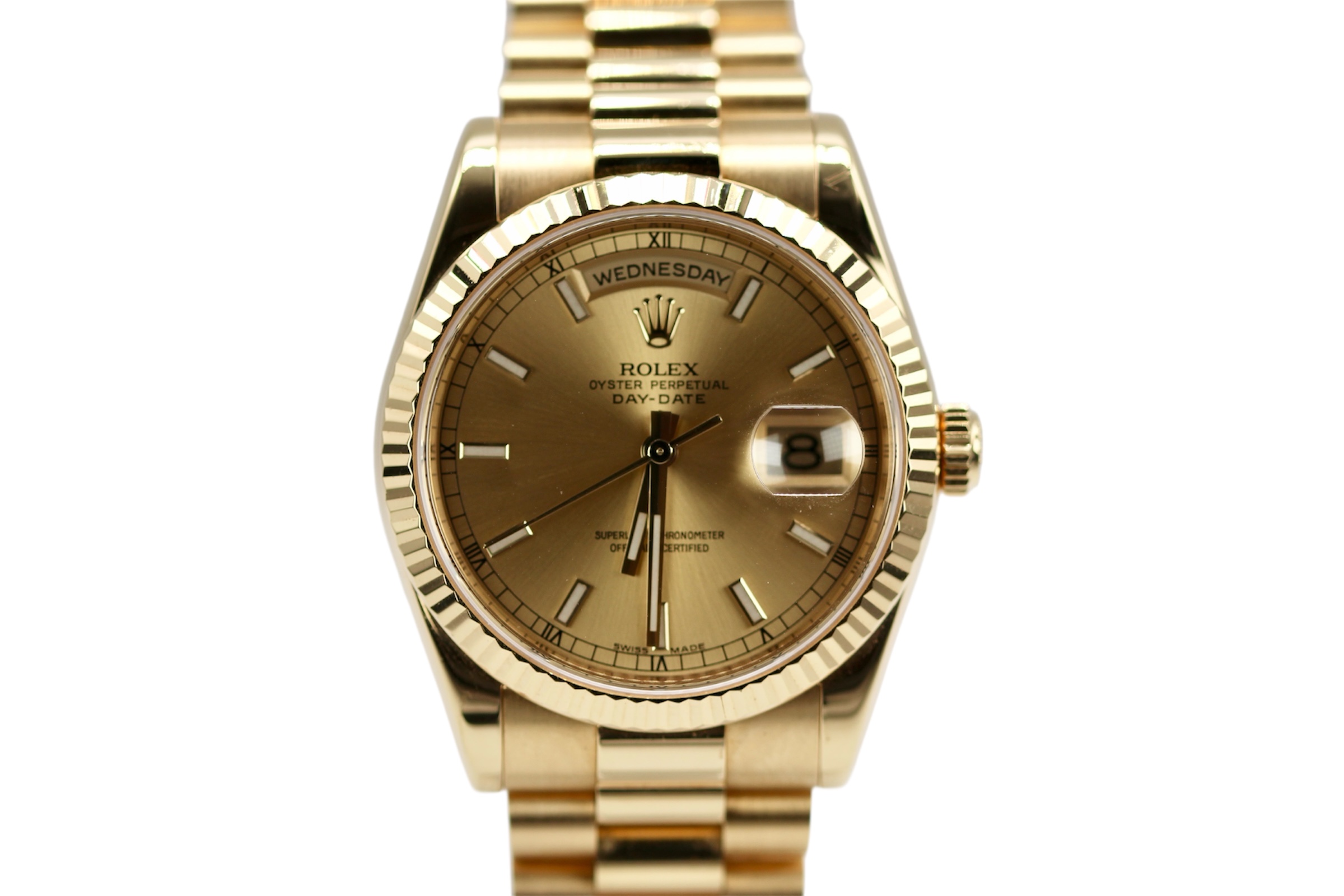 This Rolex Day-Date 118238 has a champagne baton dial and a bracelet strap. This Rolex has undergone a thorough inspection of water resistance, accuracy, functionality and condition to determine the level of reconditioning required to meet our strict standards. It has also been referenced against technical documents and manufacturer records where available to ensure authenticity and a clean history. All our watches have a 24-month warranty for your peace of mind. One of our skilled polishing technicians has removed marks on the case and bracelet of this watch, brought about by daily wear and tear, which is why this watch does not come with the remaining manufacturer’s warranty.