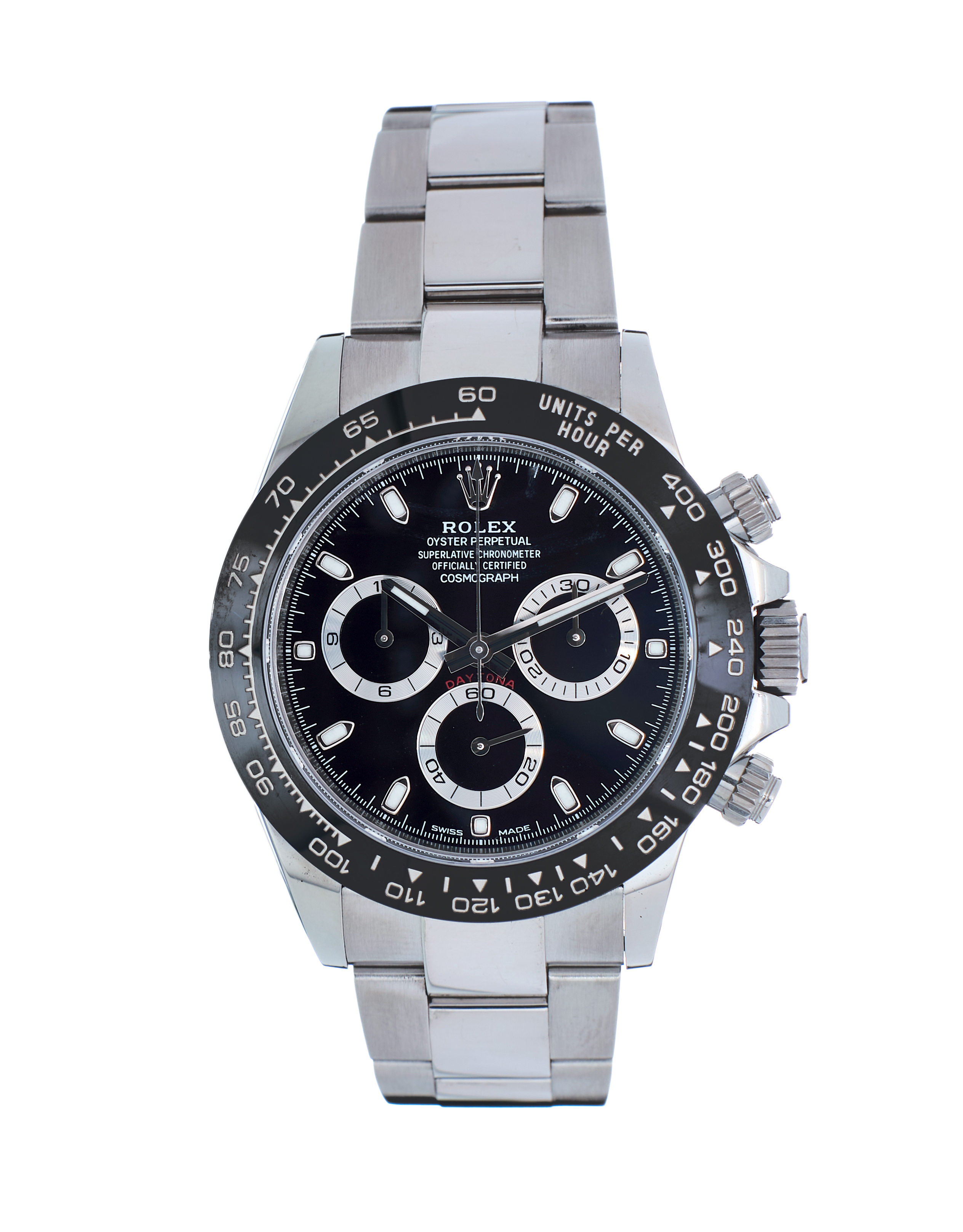 This Rolex Daytona 116500 LN has a black dial and a bracelet strap. This Rolex has undergone a thorough inspection of water resistance, accuracy, functionality and condition to determine the level of reconditioning required to meet our strict standards. It has also been referenced against technical documents and manufacturer records where available to ensure authenticity and a clean history. All our watches have a 24-month warranty for your peace of mind. One of our skilled polishing technicians has removed marks on the case and bracelet of this watch, brought about by daily wear and tear, which is why this watch does not come with the remaining manufacturer’s warranty.