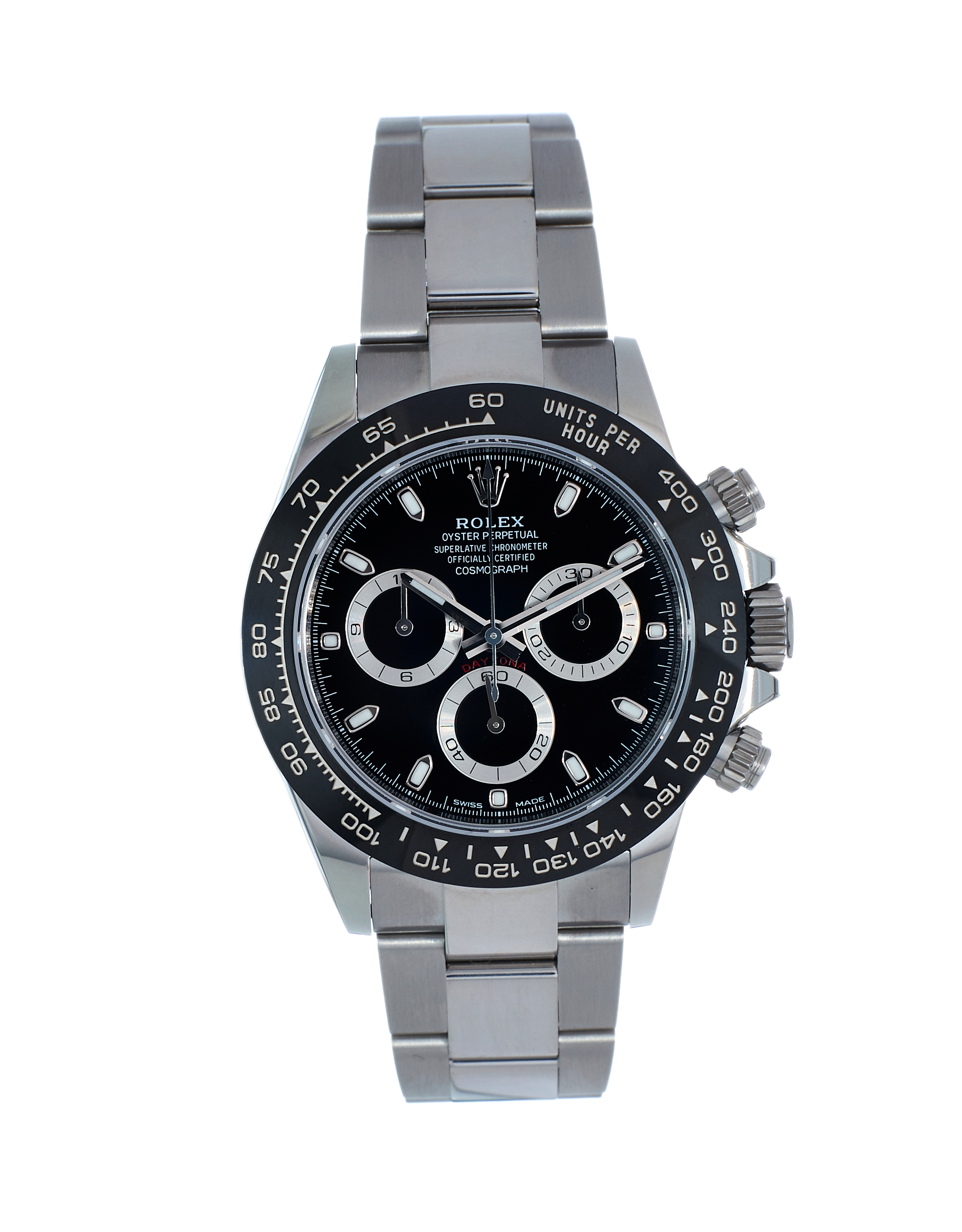 This Rolex Daytona 116500 LN has a black dial and a bracelet strap. This Rolex has undergone a thorough inspection of water resistance, accuracy, functionality and condition to determine the level of reconditioning required to meet our strict standards. It has also been referenced against technical documents and manufacturer records where available to ensure authenticity and a clean history. Our watches have a 24-month warranty for your peace of mind, in conjunction with any remaining manufacturer’s warranty from new or from service. To maintain the manufacturer’s warranty on this watch, it has not been polished in our service centre.