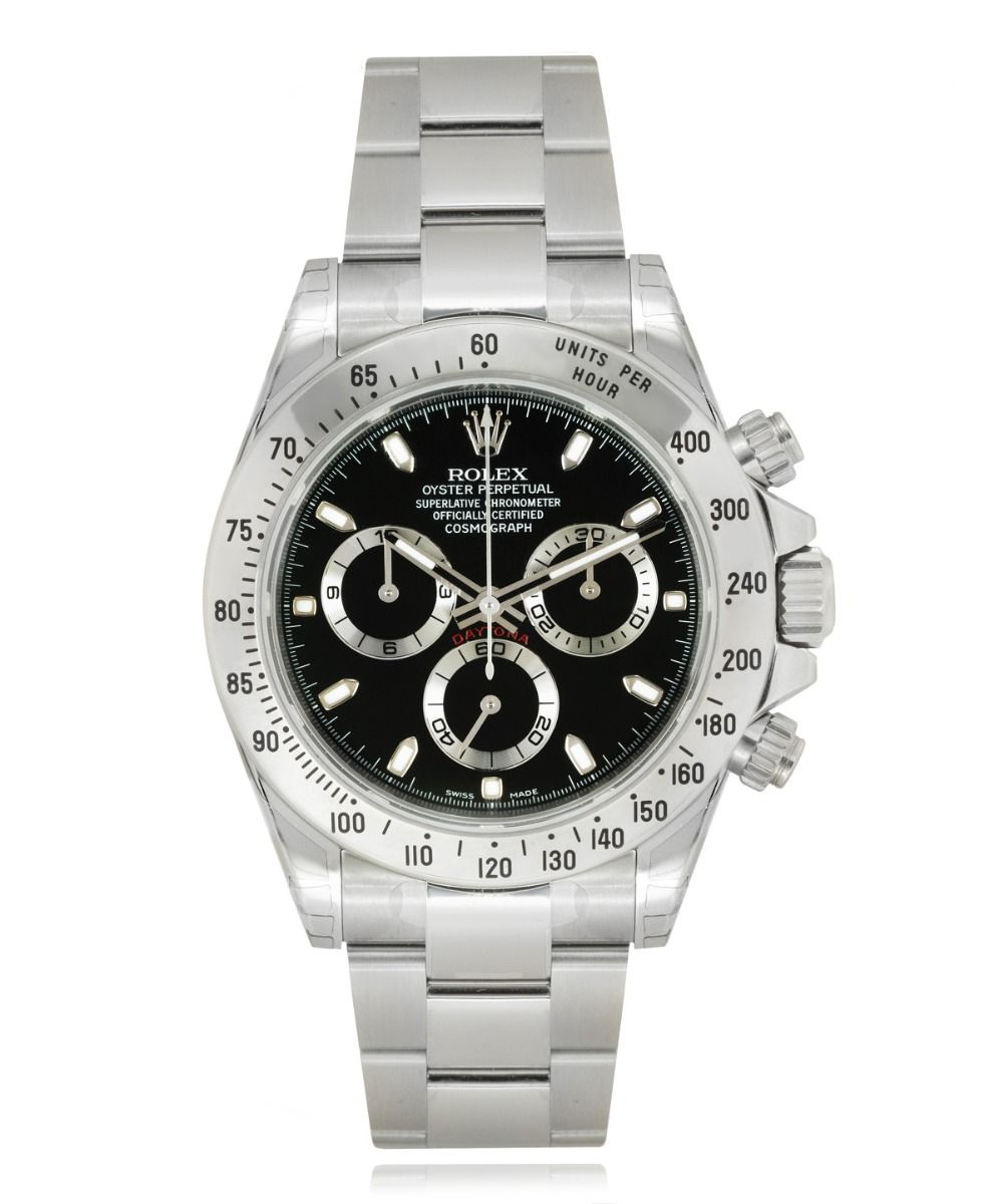 This Rolex Daytona 116520 has a black dial and a bracelet strap. This Rolex has undergone a thorough inspection of water resistance, accuracy, functionality and condition to determine the level of reconditioning required to meet our strict standards. It has also been referenced against technical documents and manufacturer records where available to ensure authenticity and a clean history. All our watches have a 24-month warranty for your peace of mind. One of our skilled polishing technicians has removed marks on the case and bracelet of this watch, brought about by daily wear and tear, which is why this watch does not come with the remaining manufacturer’s warranty.