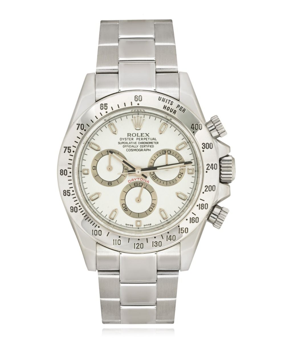 This Rolex Daytona 116520 has a white dial and a bracelet strap. This Rolex has undergone a thorough inspection of water resistance, accuracy, functionality and condition to determine the level of reconditioning required to meet our strict standards. It has also been referenced against technical documents and manufacturer records where available to ensure authenticity and a clean history. All our watches have a 24-month warranty for your peace of mind. One of our skilled polishing technicians has removed marks on the case and bracelet of this watch, brought about by daily wear and tear, which is why this watch does not come with the remaining manufacturer’s warranty.