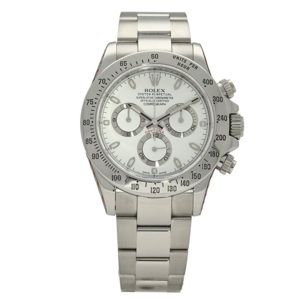 This Rolex Daytona 116520 has a white dial and a bracelet strap. This Rolex has undergone a thorough inspection of water resistance, accuracy, functionality and condition to determine the level of reconditioning required to meet our strict standards. It has also been referenced against technical documents and manufacturer records where available to ensure authenticity and a clean history. All our watches have a 24-month warranty for your peace of mind. One of our skilled polishing technicians has removed marks on the case and bracelet of this watch, brought about by daily wear and tear, which is why this watch does not come with the remaining manufacturer’s warranty.