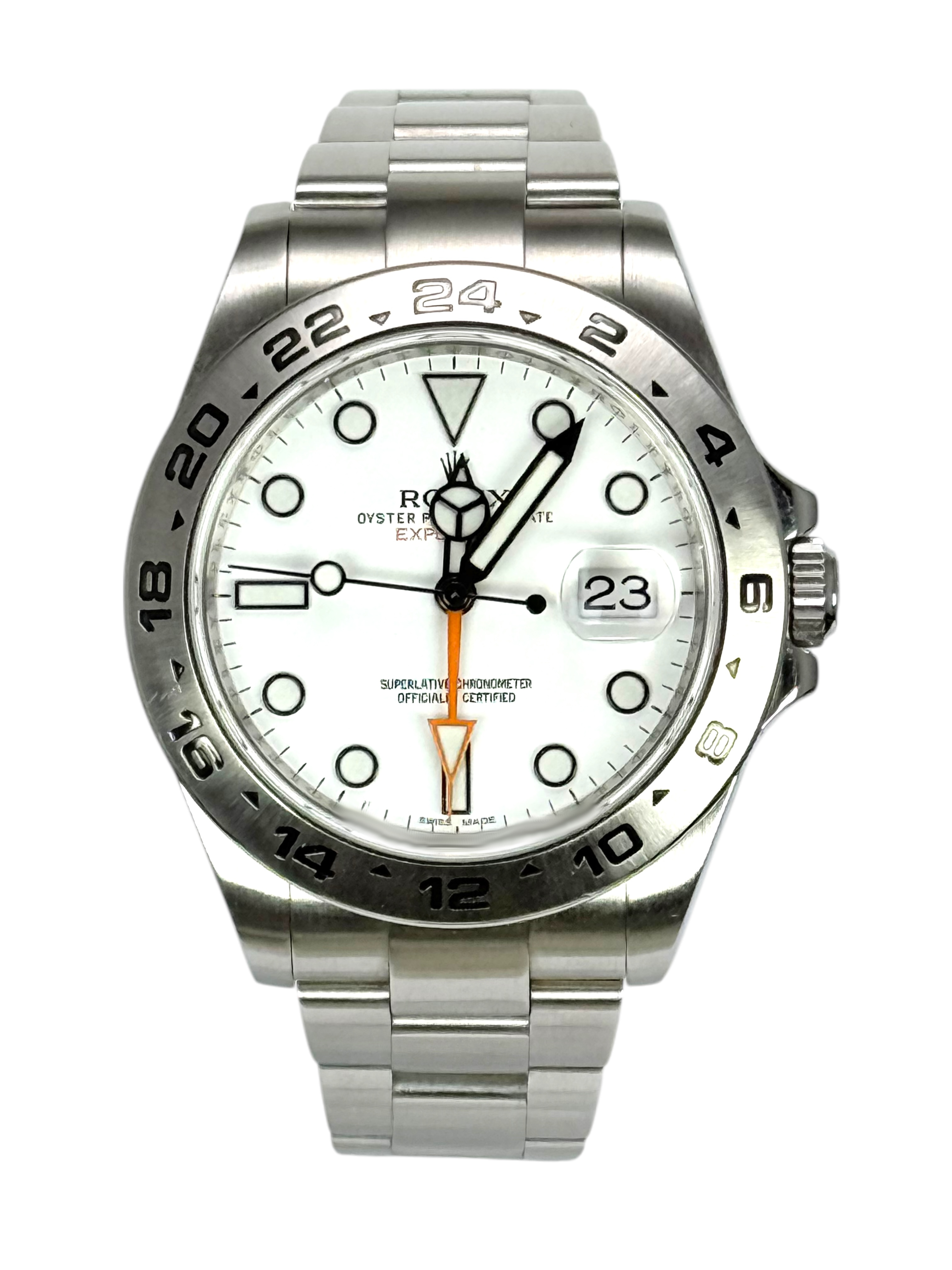 This Rolex Explorer II 216570 has a white dial and a bracelet strap. This Rolex has undergone a thorough inspection of water resistance, accuracy, functionality and condition to determine the level of reconditioning required to meet our strict standards. It has also been referenced against technical documents and manufacturer records where available to ensure authenticity and a clean history. All our watches have a 24-month warranty for your peace of mind. One of our skilled polishing technicians has removed marks on the case and bracelet of this watch, brought about by daily wear and tear, which is why this watch does not come with the remaining manufacturer’s warranty.