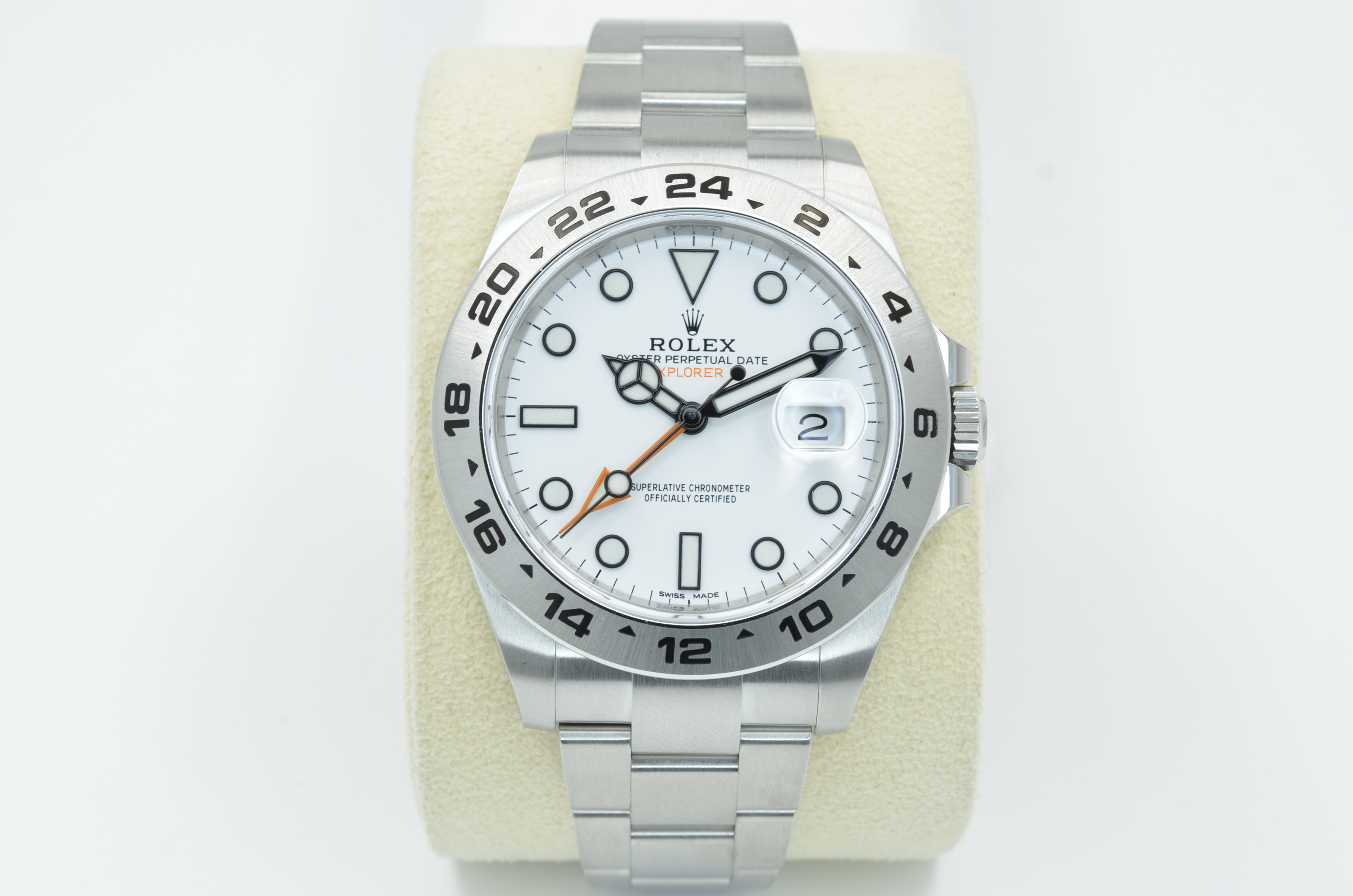 This Rolex Explorer II 216570 has a white dial and a bracelet strap. This Rolex has undergone a thorough inspection of water resistance, accuracy, functionality and condition to determine the level of reconditioning required to meet our strict standards. It has also been referenced against technical documents and manufacturer records where available to ensure authenticity and a clean history. All our watches have a 24-month warranty for your peace of mind. One of our skilled polishing technicians has removed marks on the case and bracelet of this watch, brought about by daily wear and tear, which is why this watch does not come with the remaining manufacturer’s warranty.