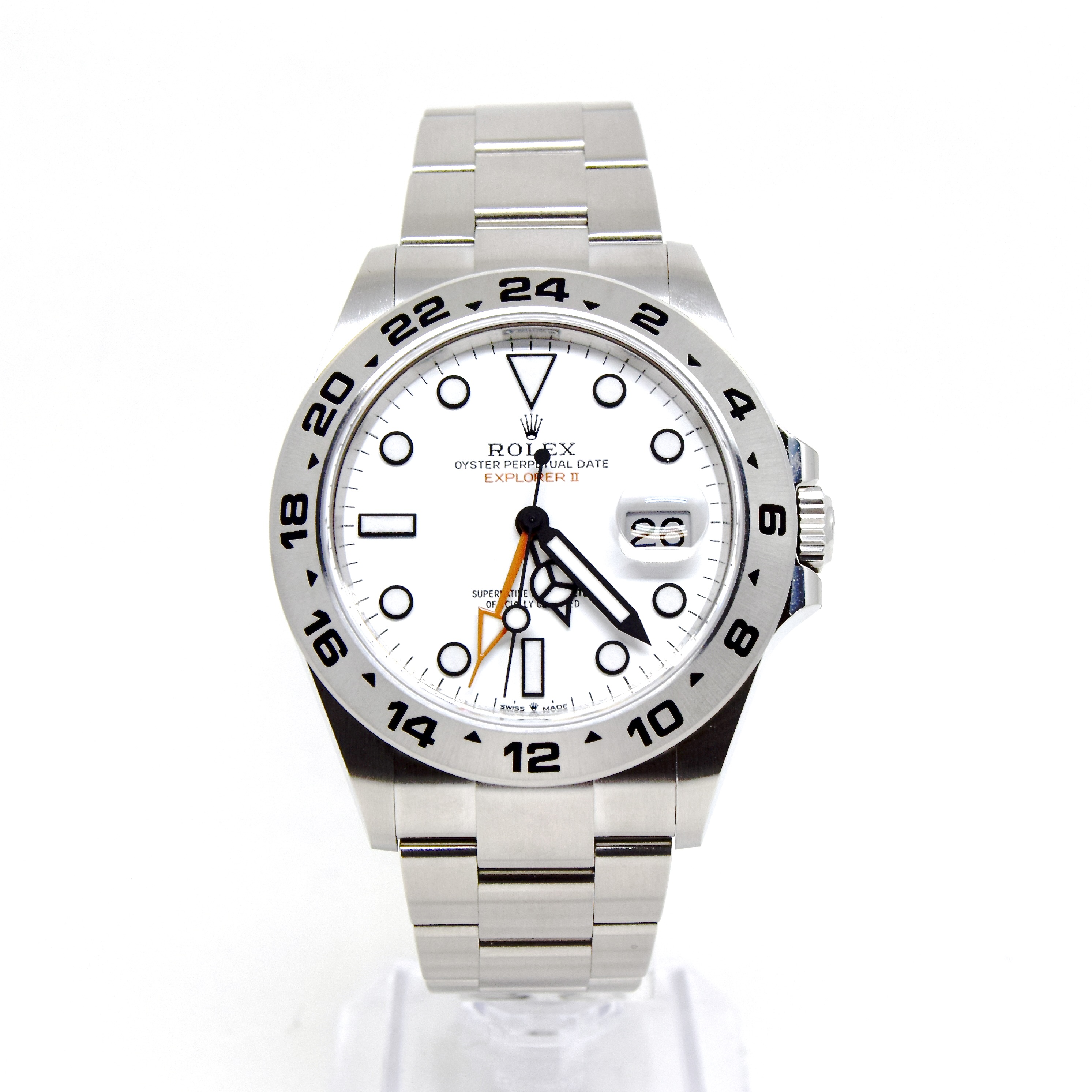 This Rolex Explorer II 226570 has a white dial and a bracelet strap. This Rolex has undergone a thorough inspection of water resistance, accuracy, functionality and condition to determine the level of reconditioning required to meet our strict standards. It has also been referenced against technical documents and manufacturer records where available to ensure authenticity and a clean history. Our watches have a 24-month warranty for your peace of mind, in conjunction with any remaining manufacturer’s warranty from new or from service. To maintain the manufacturer’s warranty on this watch, it has not been polished in our service centre.