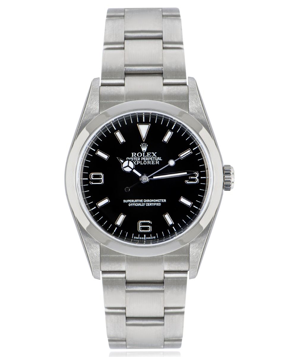 This Rolex Explorer 114270 has a black quarter arabic dial and a bracelet strap. This Rolex has undergone a thorough inspection of water resistance, accuracy, functionality and condition to determine the level of reconditioning required to meet our strict standards. It has also been referenced against technical documents and manufacturer records where available to ensure authenticity and a clean history. All our watches have a 24-month warranty for your peace of mind. One of our skilled polishing technicians has removed marks on the case and bracelet of this watch, brought about by daily wear and tear, which is why this watch does not come with the remaining manufacturer’s warranty.