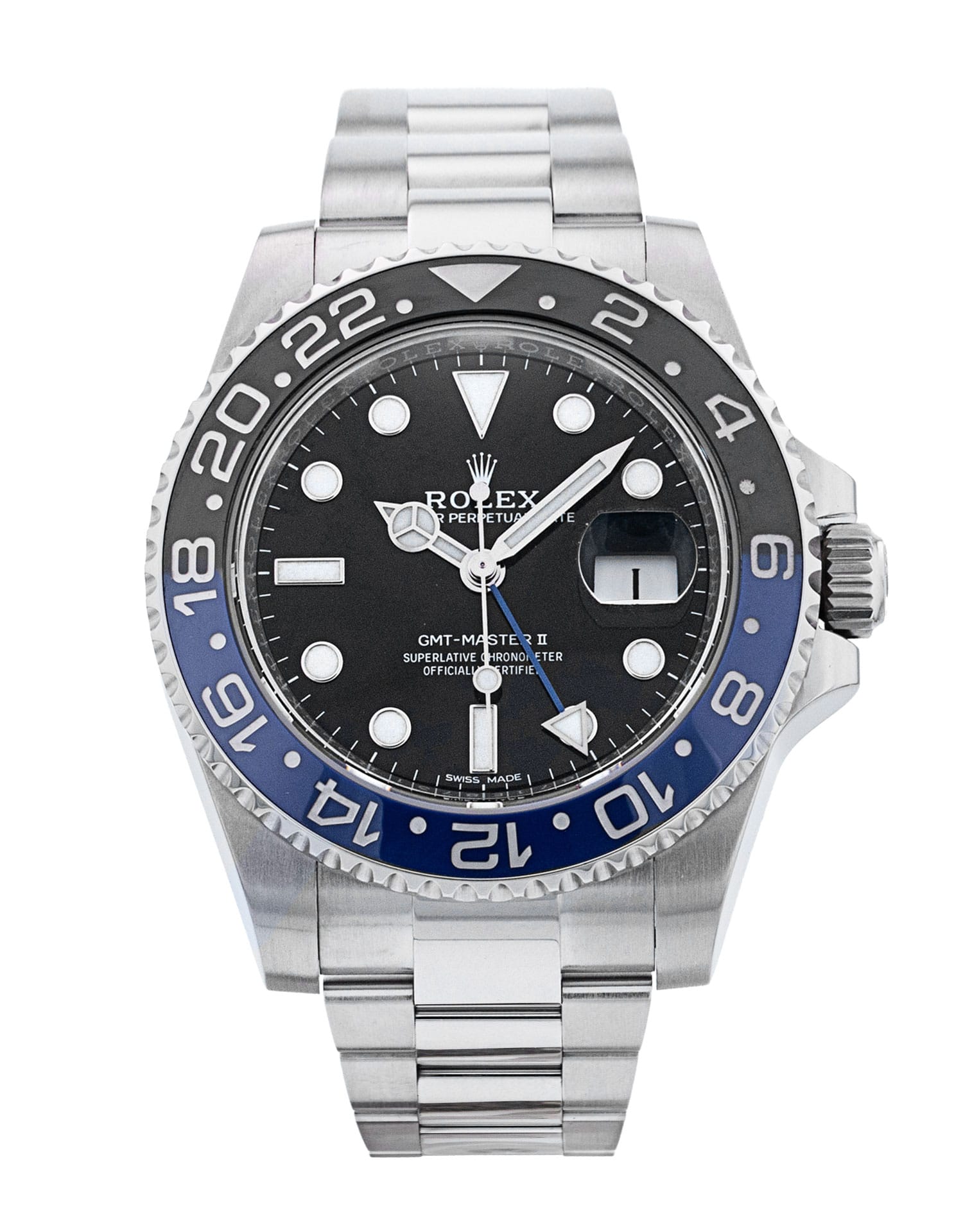 This Rolex GMT Master II 116710 BLNR has a black dial and a bracelet strap. This Rolex has undergone a thorough inspection of water resistance, accuracy, functionality and condition to determine the level of reconditioning required to meet our strict standards. It has also been referenced against technical documents and manufacturer records where available to ensure authenticity and a clean history. Our watches have a 24-month warranty for your peace of mind, in conjunction with any remaining manufacturer’s warranty from new or from service. To maintain the manufacturer’s warranty on this watch, it has not been polished in our service centre.