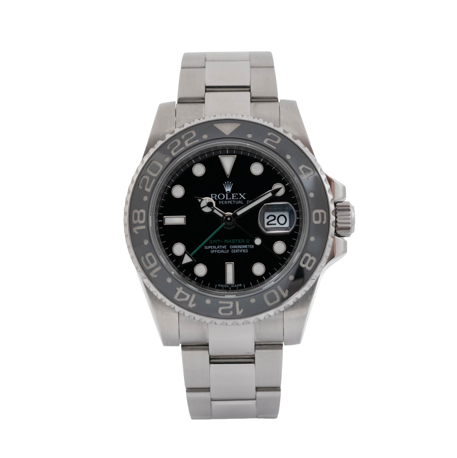 This Rolex GMT Master II 116710 LN has a black dial and a bracelet strap. This Rolex has undergone a thorough inspection of water resistance, accuracy, functionality and condition to determine the level of reconditioning required to meet our strict standards. It has also been referenced against technical documents and manufacturer records where available to ensure authenticity and a clean history. All our watches have a 24-month warranty for your peace of mind. One of our skilled polishing technicians has removed marks on the case and bracelet of this watch, brought about by daily wear and tear, which is why this watch does not come with the remaining manufacturer’s warranty.
