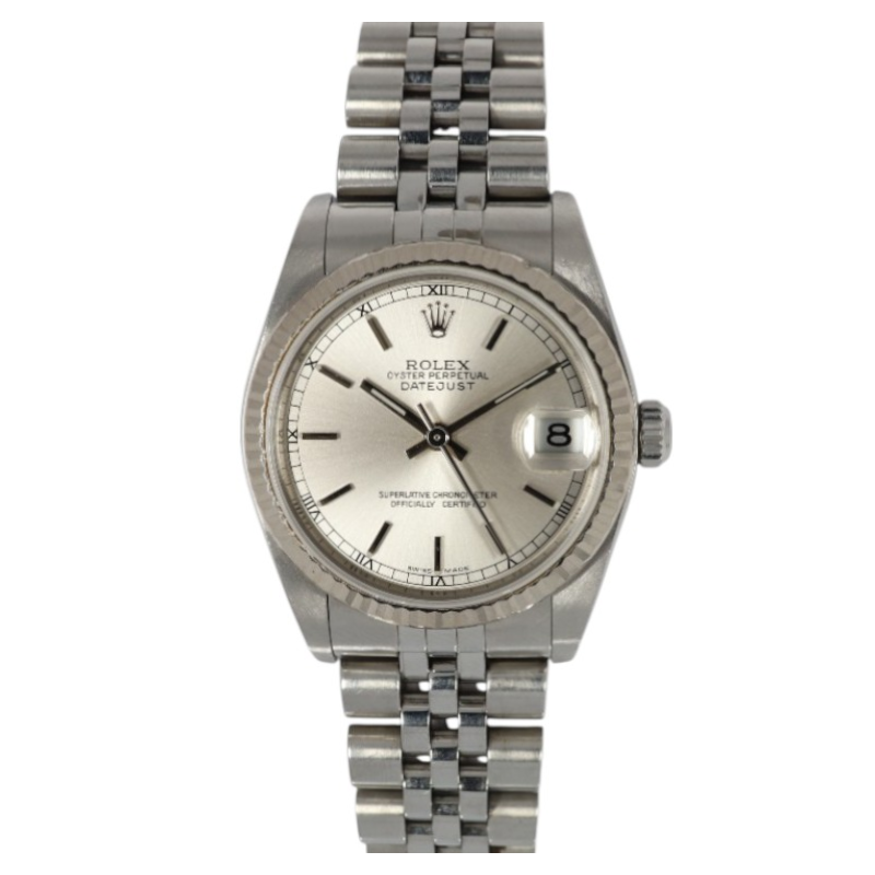 This Rolex Mid-Size Datejust 78274 has a silver baton dial and a bracelet strap. This Rolex has undergone a thorough inspection of water resistance, accuracy, functionality and condition to determine the level of reconditioning required to meet our strict standards. It has also been referenced against technical documents and manufacturer records where available to ensure authenticity and a clean history. All our watches have a 24-month warranty for your peace of mind. One of our skilled polishing technicians has removed marks on the case and bracelet of this watch, brought about by daily wear and tear, which is why this watch does not come with the remaining manufacturer’s warranty.