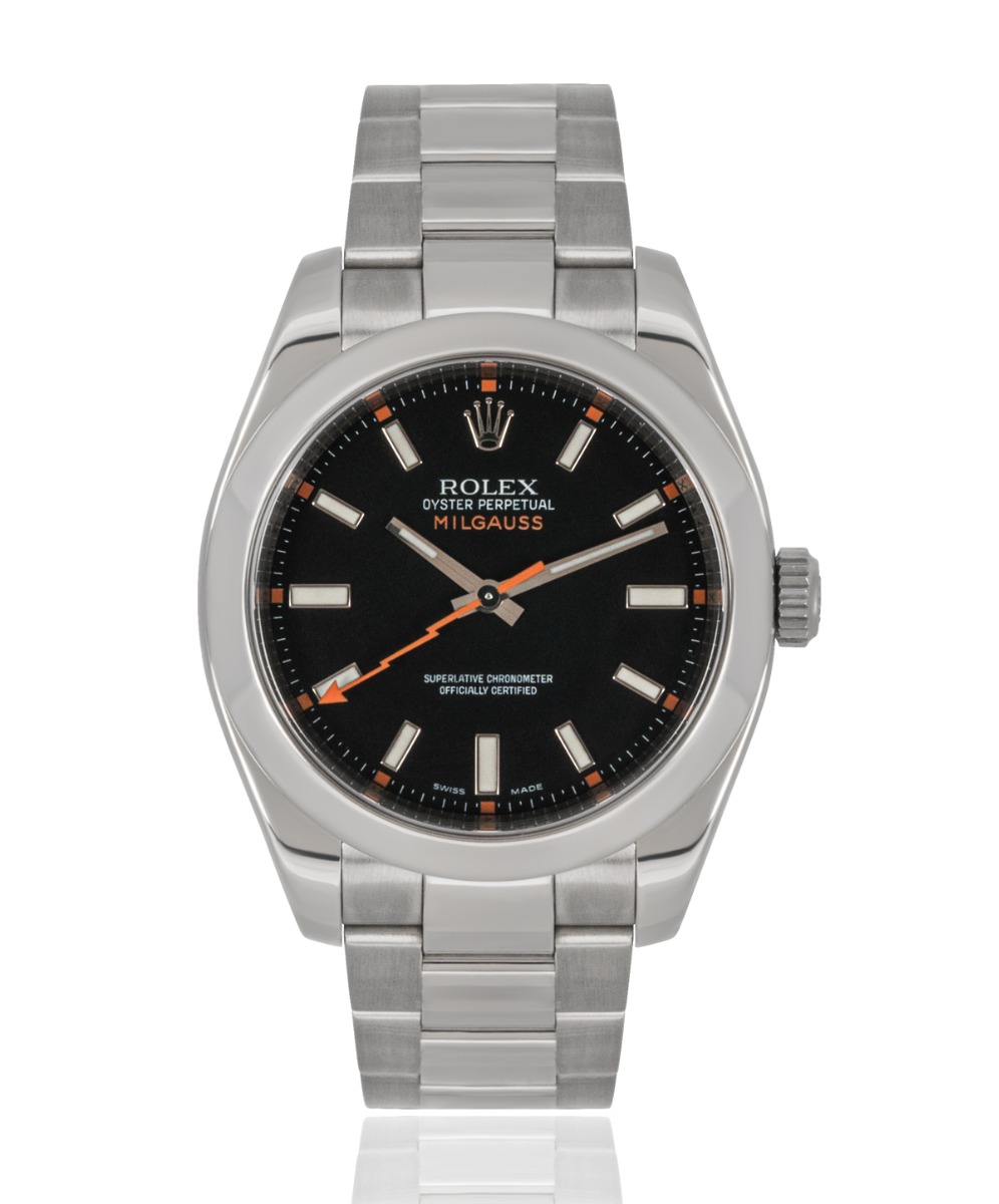 This Rolex Milgauss 116400 has a black baton dial and a bracelet strap. This Rolex has undergone a thorough inspection of water resistance, accuracy, functionality and condition to determine the level of reconditioning required to meet our strict standards. It has also been referenced against technical documents and manufacturer records where available to ensure authenticity and a clean history. All our watches have a 24-month warranty for your peace of mind. One of our skilled polishing technicians has removed marks on the case and bracelet of this watch, brought about by daily wear and tear, which is why this watch does not come with the remaining manufacturer’s warranty.