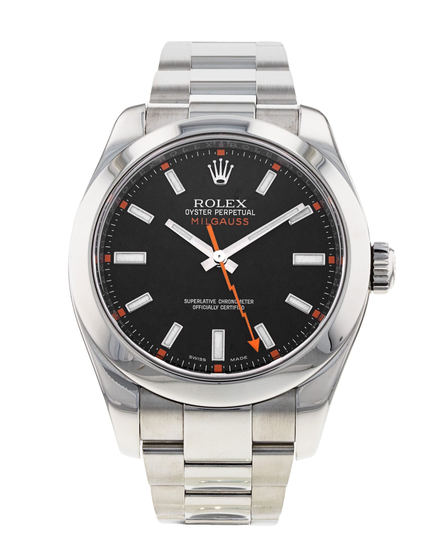 This Rolex Milgauss 116400 has a black baton dial and a bracelet strap. This Rolex has undergone a thorough inspection of water resistance, accuracy, functionality and condition to determine the level of reconditioning required to meet our strict standards. It has also been referenced against technical documents and manufacturer records where available to ensure authenticity and a clean history. All our watches have a 24-month warranty for your peace of mind. One of our skilled polishing technicians has removed marks on the case and bracelet of this watch, brought about by daily wear and tear, which is why this watch does not come with the remaining manufacturer’s warranty.