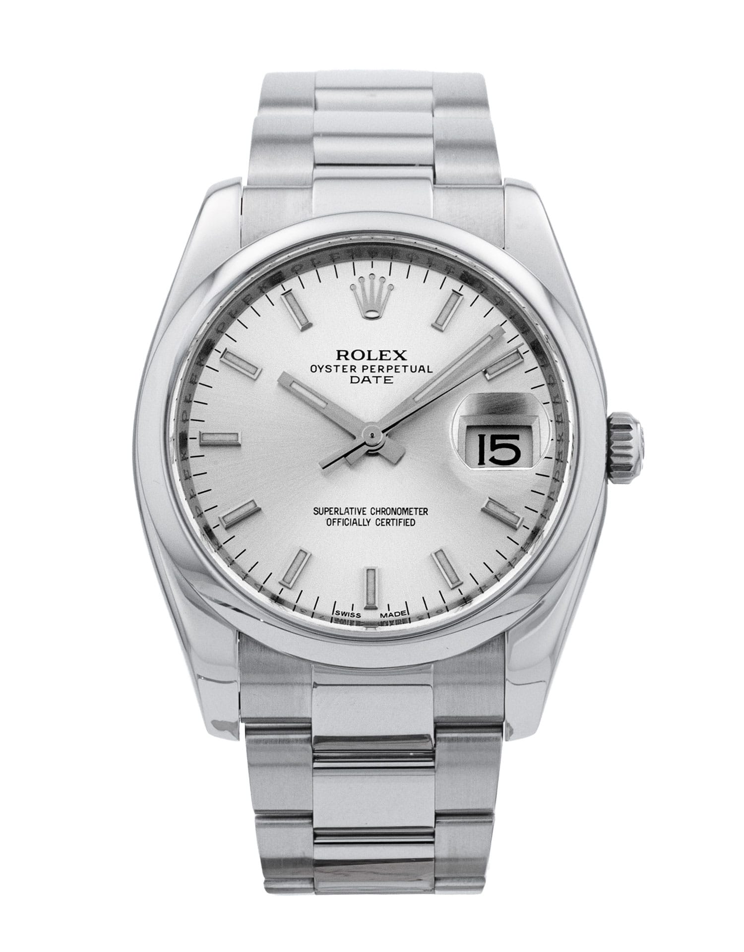 This Rolex Oyster Perpetual Date 115200 has a silver baton dial and a bracelet strap. This Rolex has undergone a thorough inspection of water resistance, accuracy, functionality and condition to determine the level of reconditioning required to meet our strict standards. It has also been referenced against technical documents and manufacturer records where available to ensure authenticity and a clean history. Our watches have a 24-month warranty for your peace of mind, in conjunction with any remaining manufacturer’s warranty from new or from service. To maintain the manufacturer’s warranty on this watch, it has not been polished in our service centre.