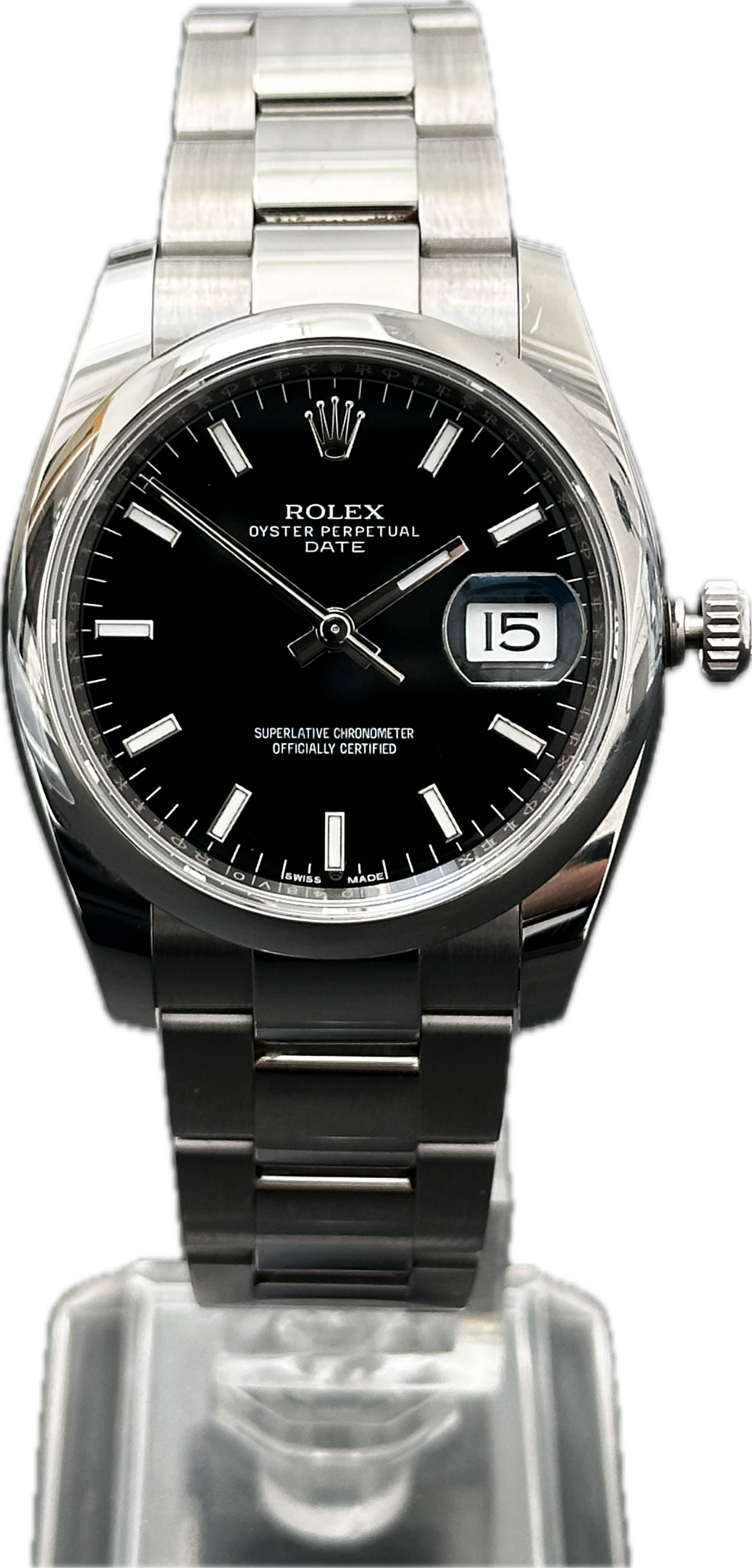 This Rolex Oyster Perpetual Date 115200 has a black baton dial and a bracelet strap. This Rolex has undergone a thorough inspection of water resistance, accuracy, functionality and condition to determine the level of reconditioning required to meet our strict standards. It has also been referenced against technical documents and manufacturer records where available to ensure authenticity and a clean history. All our watches have a 24-month warranty for your peace of mind. One of our skilled polishing technicians has removed marks on the case and bracelet of this watch, brought about by daily wear and tear, which is why this watch does not come with the remaining manufacturer’s warranty.