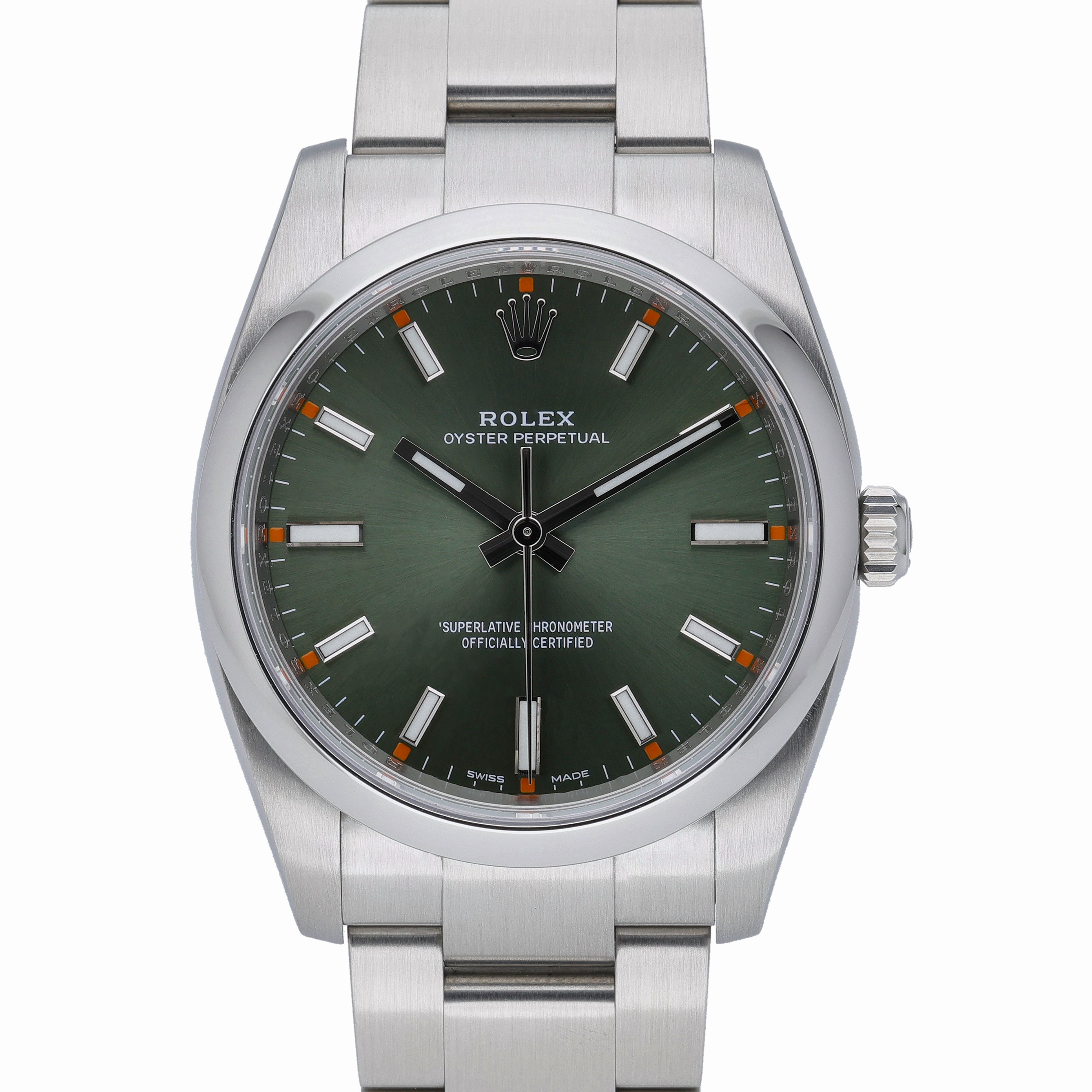 This Rolex Oyster Perpetual 114200 has a olive green baton dial and a bracelet strap. This Rolex has undergone a thorough inspection of water resistance, accuracy, functionality and condition to determine the level of reconditioning required to meet our strict standards. It has also been referenced against technical documents and manufacturer records where available to ensure authenticity and a clean history. All our watches have a 24-month warranty for your peace of mind. One of our skilled polishing technicians has removed marks on the case and bracelet of this watch, brought about by daily wear and tear, which is why this watch does not come with the remaining manufacturer’s warranty.