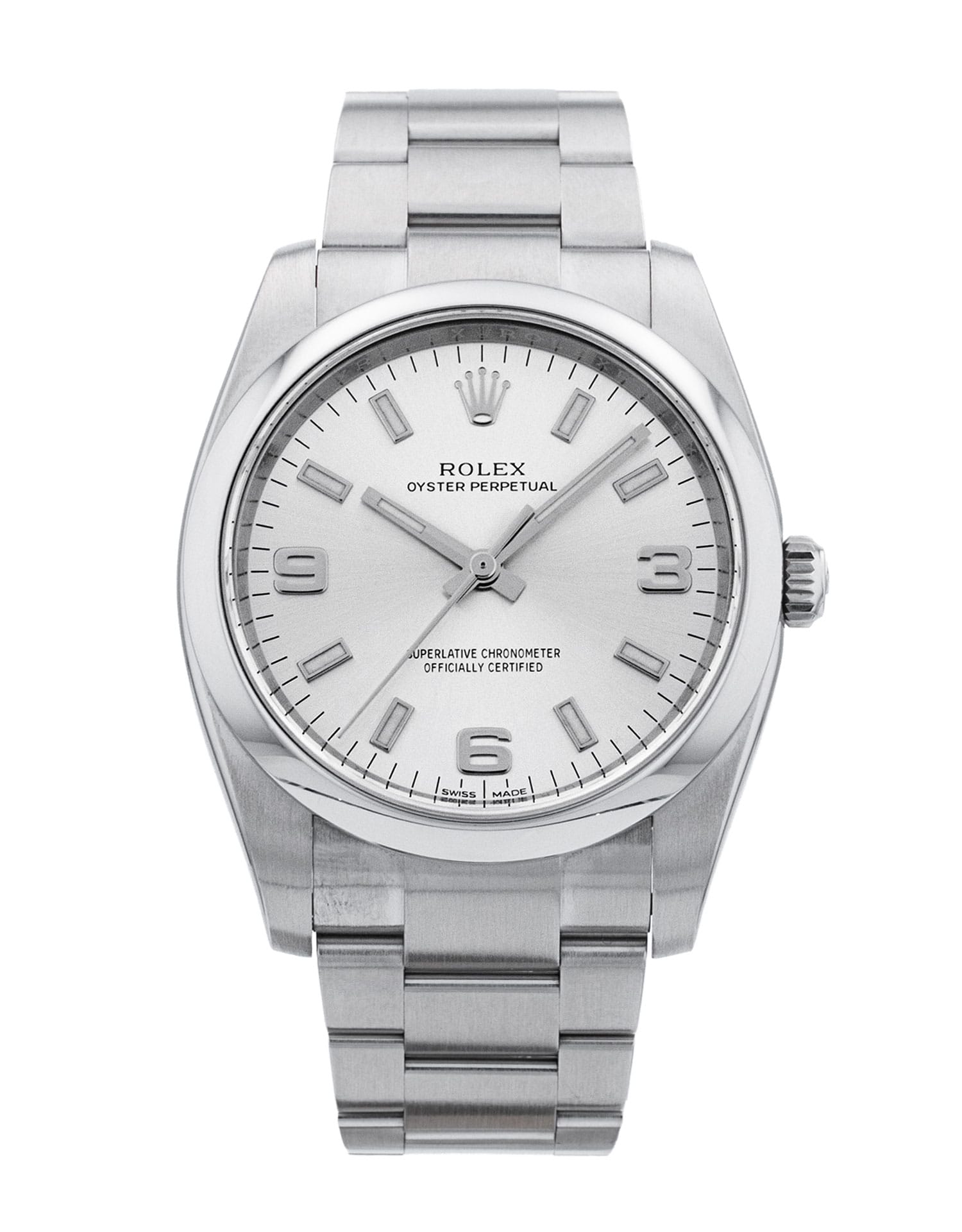 This Rolex Oyster Perpetual 114200 has a silver quarter arabic dial and a bracelet strap. This Rolex has undergone a thorough inspection of water resistance, accuracy, functionality and condition to determine the level of reconditioning required to meet our strict standards. It has also been referenced against technical documents and manufacturer records where available to ensure authenticity and a clean history. Our watches have a 24-month warranty for your peace of mind, in conjunction with any remaining manufacturer’s warranty from new or from service. To maintain the manufacturer’s warranty on this watch, it has not been polished in our service centre.