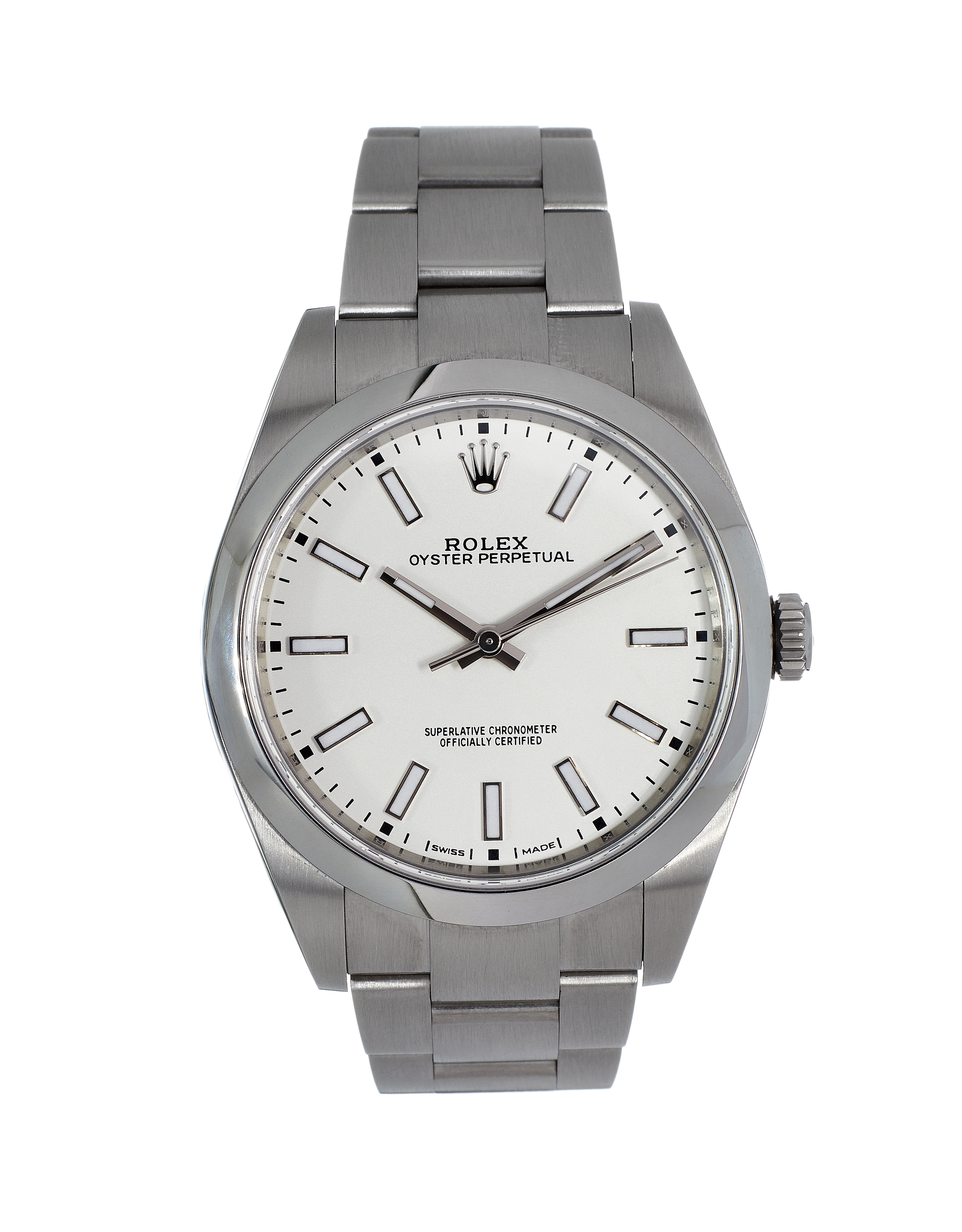 This Rolex Oyster Perpetual 114300 has a white baton dial and a bracelet strap. This Rolex has undergone a thorough inspection of water resistance, accuracy, functionality and condition to determine the level of reconditioning required to meet our strict standards. It has also been referenced against technical documents and manufacturer records where available to ensure authenticity and a clean history. All our watches have a 24-month warranty for your peace of mind. One of our skilled polishing technicians has removed marks on the case and bracelet of this watch, brought about by daily wear and tear, which is why this watch does not come with the remaining manufacturer’s warranty.