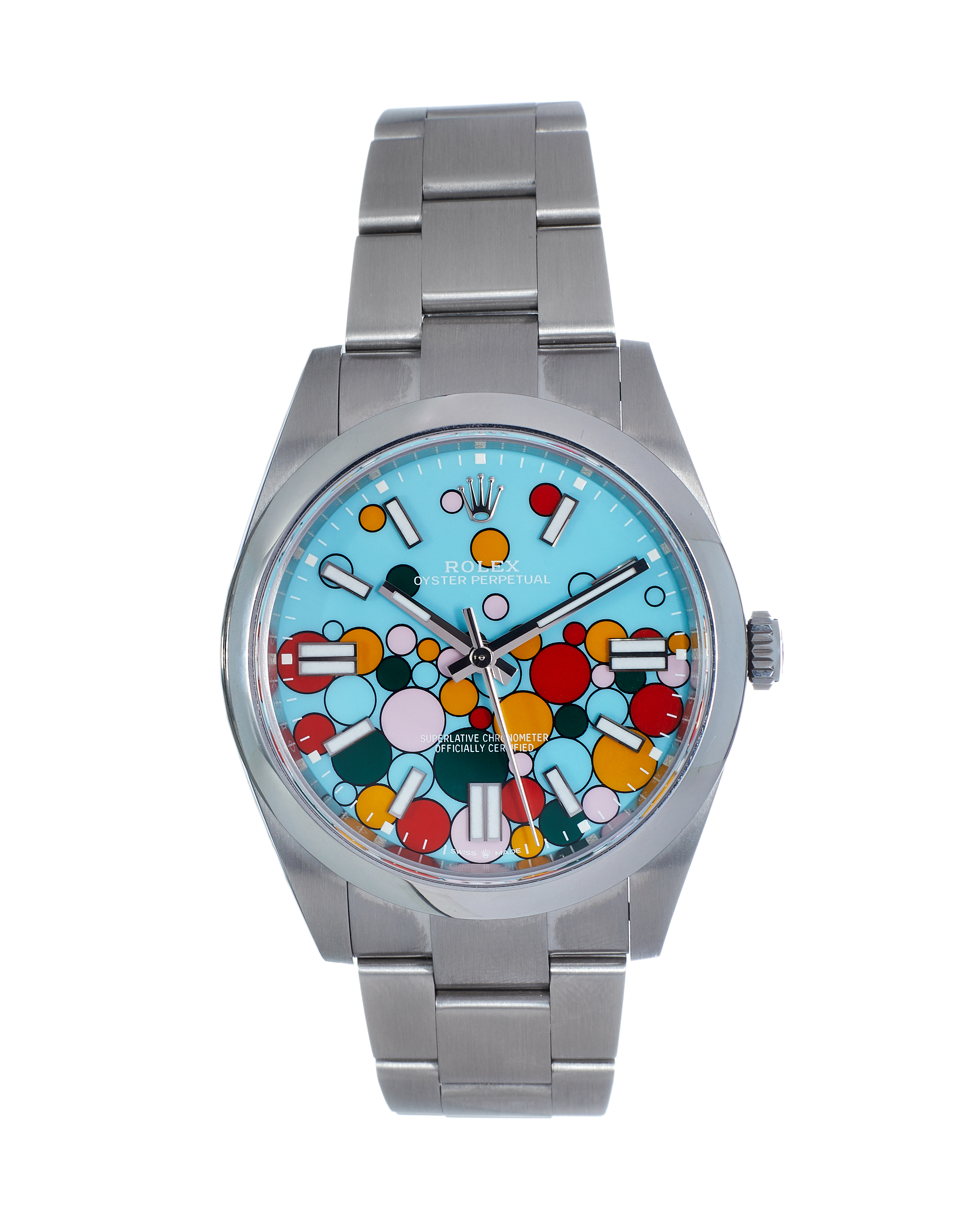 This Rolex Oyster Perpetual 124300 has a turquoise blue - celebration motif dial and a bracelet strap. This Rolex has undergone a thorough inspection of water resistance, accuracy, functionality and condition to determine the level of reconditioning required to meet our strict standards. It has also been referenced against technical documents and manufacturer records where available to ensure authenticity and a clean history. Our watches have a 24-month warranty for your peace of mind, in conjunction with any remaining manufacturer’s warranty from new or from service. To maintain the manufacturer’s warranty on this watch, it has not been polished in our service centre.