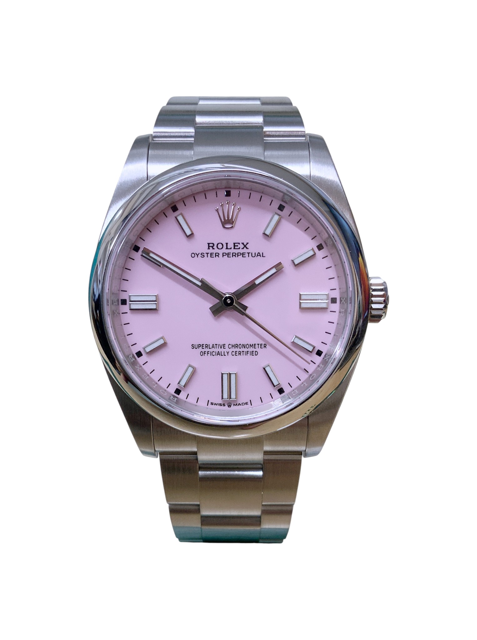 This Rolex Oyster Perpetual 126000 has a candy pink dial and a bracelet strap. This Rolex has undergone a thorough inspection of water resistance, accuracy, functionality and condition to determine the level of reconditioning required to meet our strict standards. It has also been referenced against technical documents and manufacturer records where available to ensure authenticity and a clean history. Our watches have a 24-month warranty for your peace of mind, in conjunction with any remaining manufacturer’s warranty from new or from service. To maintain the manufacturer’s warranty on this watch, it has not been polished in our service centre.
