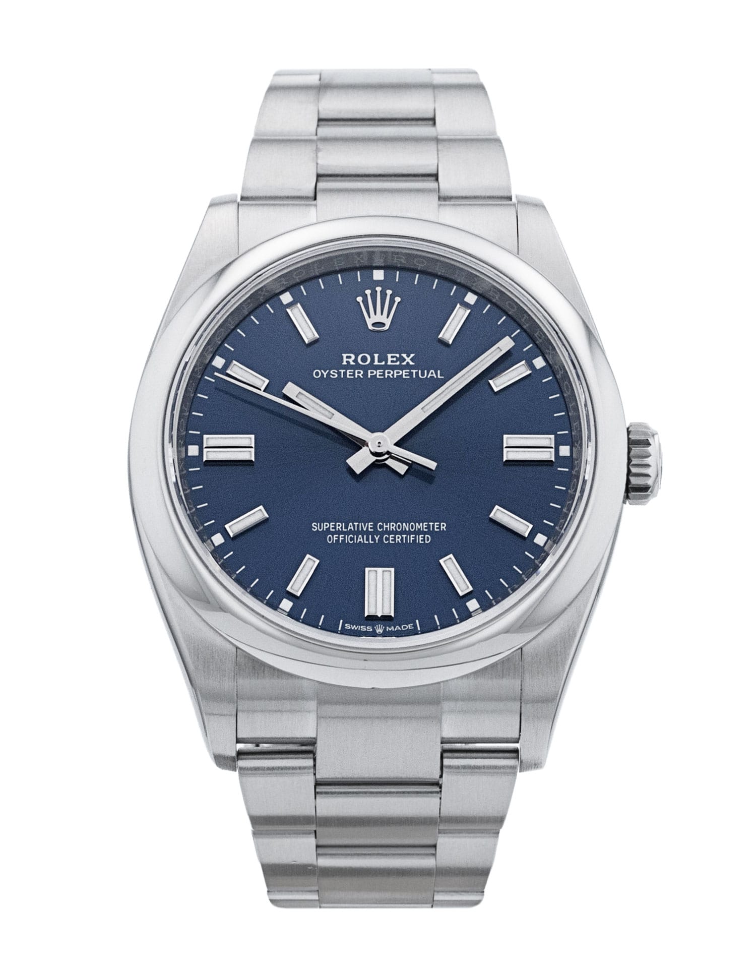 This Rolex Oyster Perpetual 126000 has a blue baton dial and a bracelet strap. This Rolex has undergone a thorough inspection of water resistance, accuracy, functionality and condition to determine the level of reconditioning required to meet our strict standards. It has also been referenced against technical documents and manufacturer records where available to ensure authenticity and a clean history. All our watches have a 24-month warranty for your peace of mind. One of our skilled polishing technicians has removed marks on the case and bracelet of this watch, brought about by daily wear and tear, which is why this watch does not come with the remaining manufacturer’s warranty.