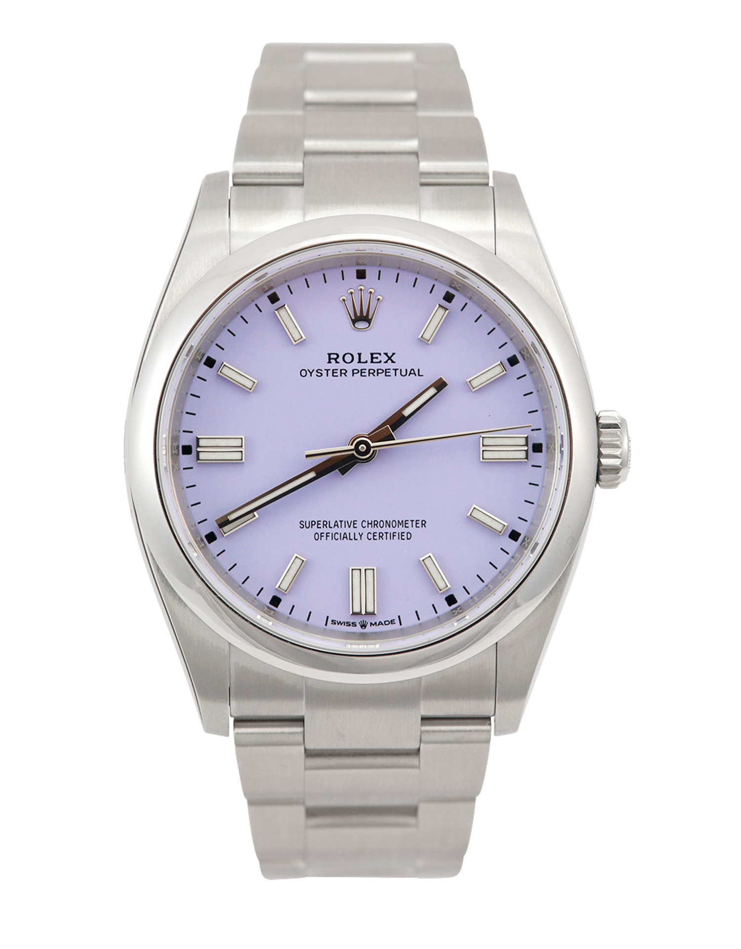 This Rolex Oyster Perpetual 126000 has a lavender dial and a bracelet strap. This Rolex has undergone a thorough inspection of water resistance, accuracy, functionality and condition to determine the level of reconditioning required to meet our strict standards. It has also been referenced against technical documents and manufacturer records where available to ensure authenticity and a clean history. Our watches have a 24-month warranty for your peace of mind, in conjunction with any remaining manufacturer’s warranty from new or from service. To maintain the manufacturer’s warranty on this watch, it has not been polished in our service centre.