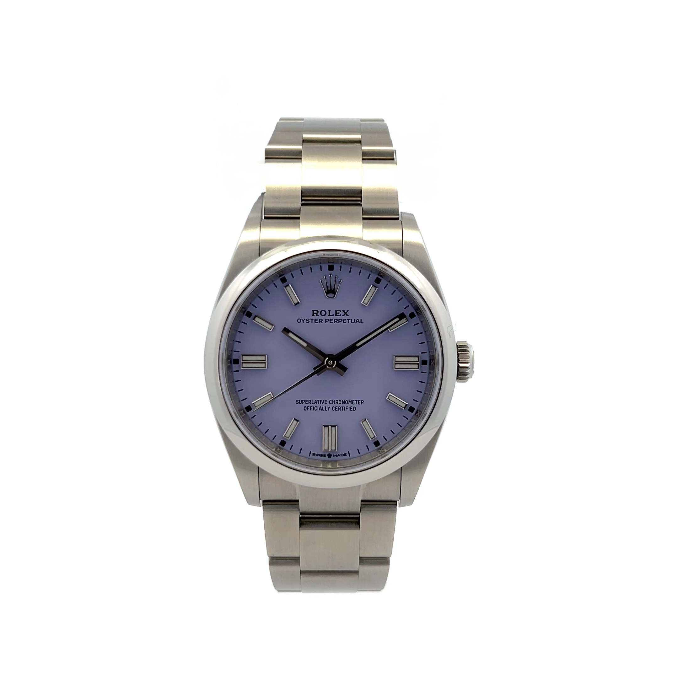 This Rolex Oyster Perpetual 126000 has a lavender dial and a bracelet strap. This Rolex has undergone a thorough inspection of water resistance, accuracy, functionality and condition to determine the level of reconditioning required to meet our strict standards. It has also been referenced against technical documents and manufacturer records where available to ensure authenticity and a clean history. Our watches have a 24-month warranty for your peace of mind, in conjunction with any remaining manufacturer’s warranty from new or from service. To maintain the manufacturer’s warranty on this watch, it has not been polished in our service centre.