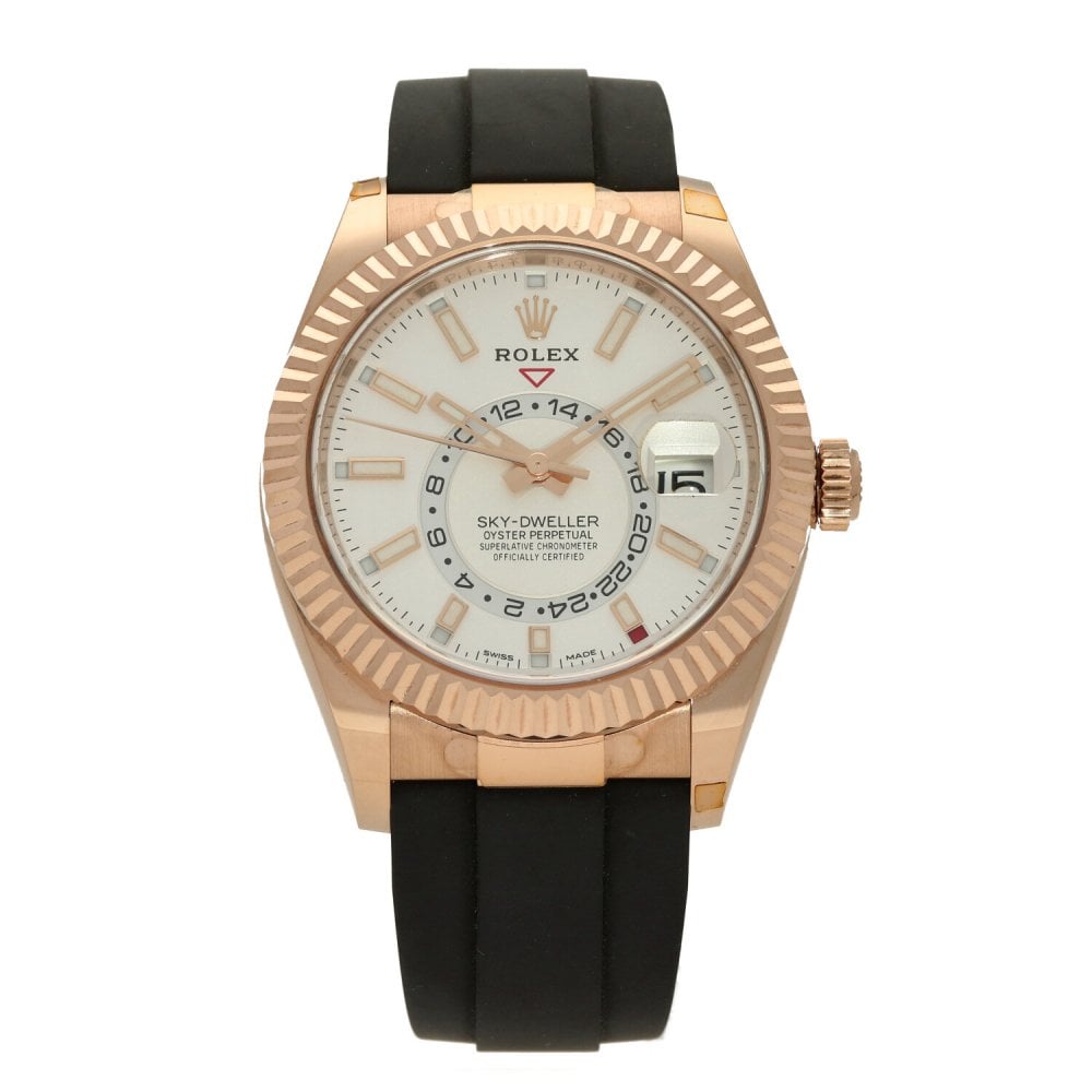 This Rolex Sky-Dweller 326235 has a white baton dial and a rubber strap. This Rolex has undergone a thorough inspection of water resistance, accuracy, functionality and condition to determine the level of reconditioning required to meet our strict standards. It has also been referenced against technical documents and manufacturer records where available to ensure authenticity and a clean history. All our watches have a 24-month warranty for your peace of mind. One of our skilled polishing technicians has removed marks on the case and bracelet of this watch, brought about by daily wear and tear, which is why this watch does not come with the remaining manufacturer’s warranty.