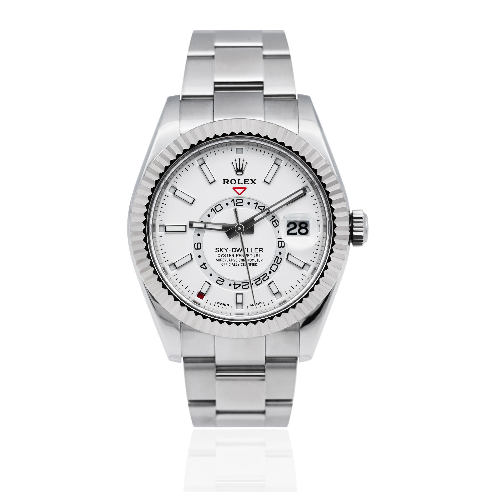 This Rolex Sky-Dweller 326934 has a white baton dial and a bracelet strap. This Rolex has undergone a thorough inspection of water resistance, accuracy, functionality and condition to determine the level of reconditioning required to meet our strict standards. It has also been referenced against technical documents and manufacturer records where available to ensure authenticity and a clean history. All our watches have a 24-month warranty for your peace of mind. One of our skilled polishing technicians has removed marks on the case and bracelet of this watch, brought about by daily wear and tear, which is why this watch does not come with the remaining manufacturer’s warranty.