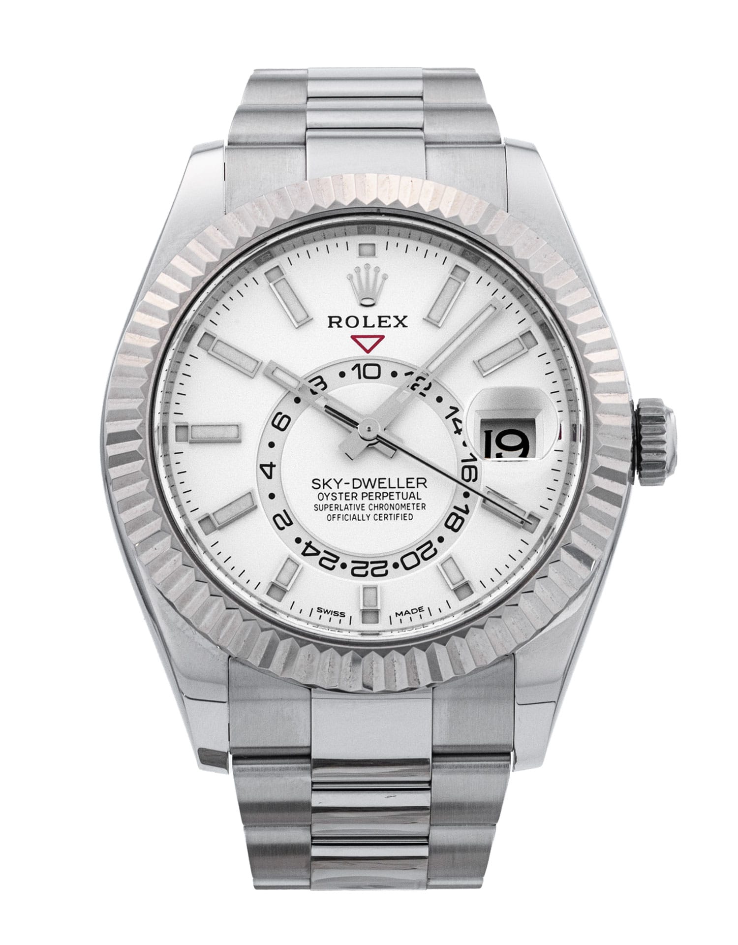 This Rolex Sky-Dweller 326934 has a white baton dial and a bracelet strap. This Rolex has undergone a thorough inspection of water resistance, accuracy, functionality and condition to determine the level of reconditioning required to meet our strict standards. It has also been referenced against technical documents and manufacturer records where available to ensure authenticity and a clean history. Our watches have a 24-month warranty for your peace of mind, in conjunction with any remaining manufacturer’s warranty from new or from service. To maintain the manufacturer’s warranty on this watch, it has not been polished in our service centre.