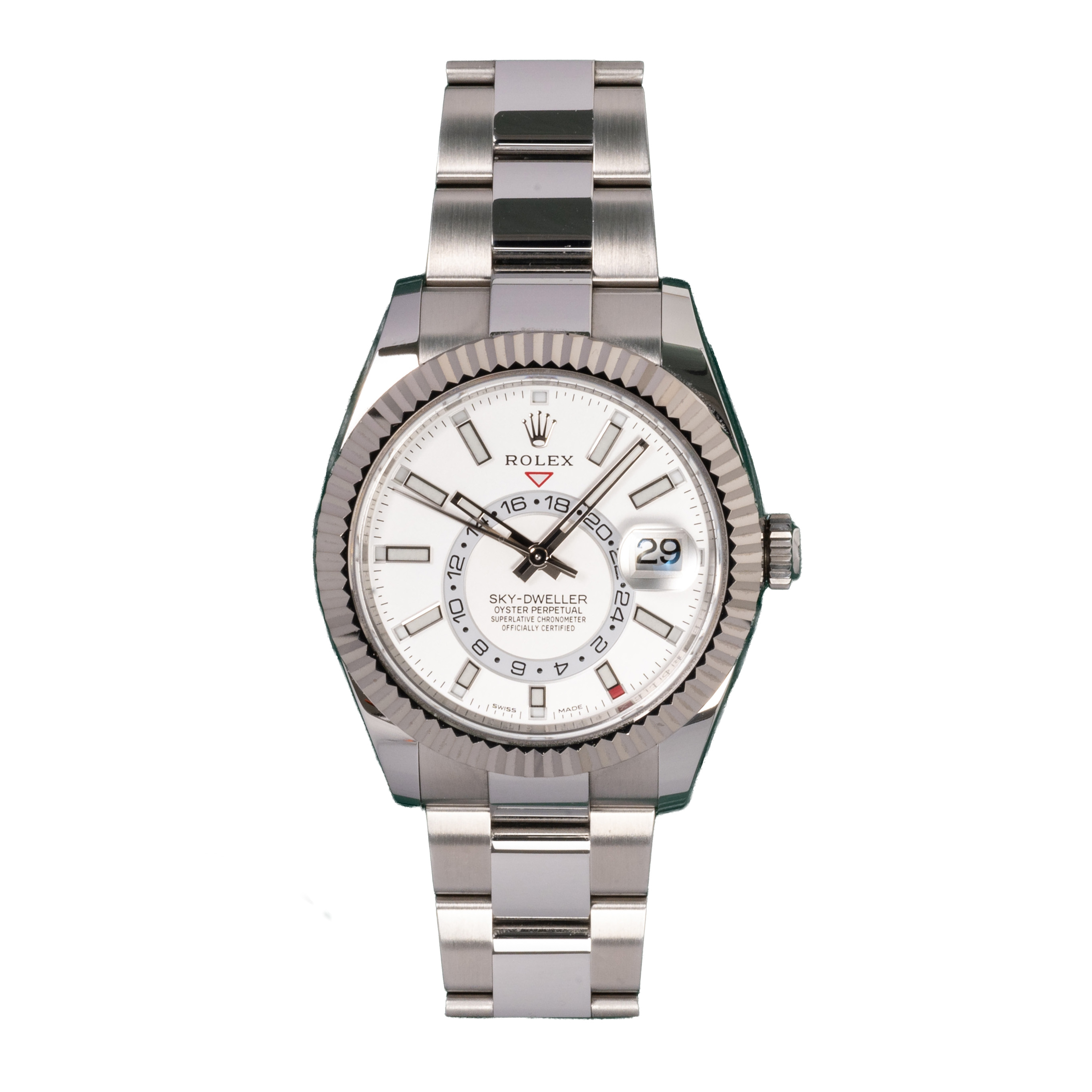This Rolex Sky-Dweller 326934 has a white baton dial and a bracelet strap. This Rolex has undergone a thorough inspection of water resistance, accuracy, functionality and condition to determine the level of reconditioning required to meet our strict standards. It has also been referenced against technical documents and manufacturer records where available to ensure authenticity and a clean history. Our watches have a 24-month warranty for your peace of mind, in conjunction with any remaining manufacturer’s warranty from new or from service. To maintain the manufacturer’s warranty on this watch, it has not been polished in our service centre.