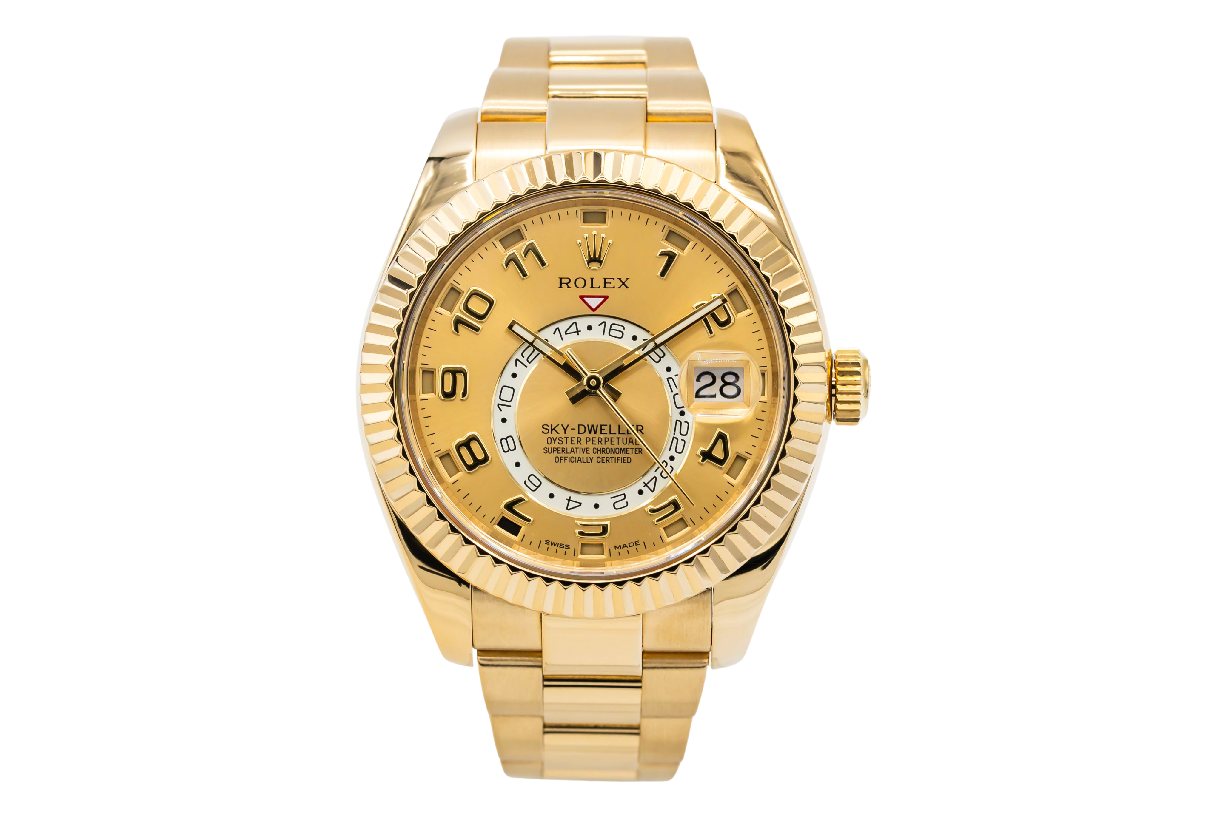 This Rolex Sky-Dweller 326938 has a champagne arabic dial and a bracelet strap. This Rolex has undergone a thorough inspection of water resistance, accuracy, functionality and condition to determine the level of reconditioning required to meet our strict standards. It has also been referenced against technical documents and manufacturer records where available to ensure authenticity and a clean history. All our watches have a 24-month warranty for your peace of mind. One of our skilled polishing technicians has removed marks on the case and bracelet of this watch, brought about by daily wear and tear, which is why this watch does not come with the remaining manufacturer’s warranty.