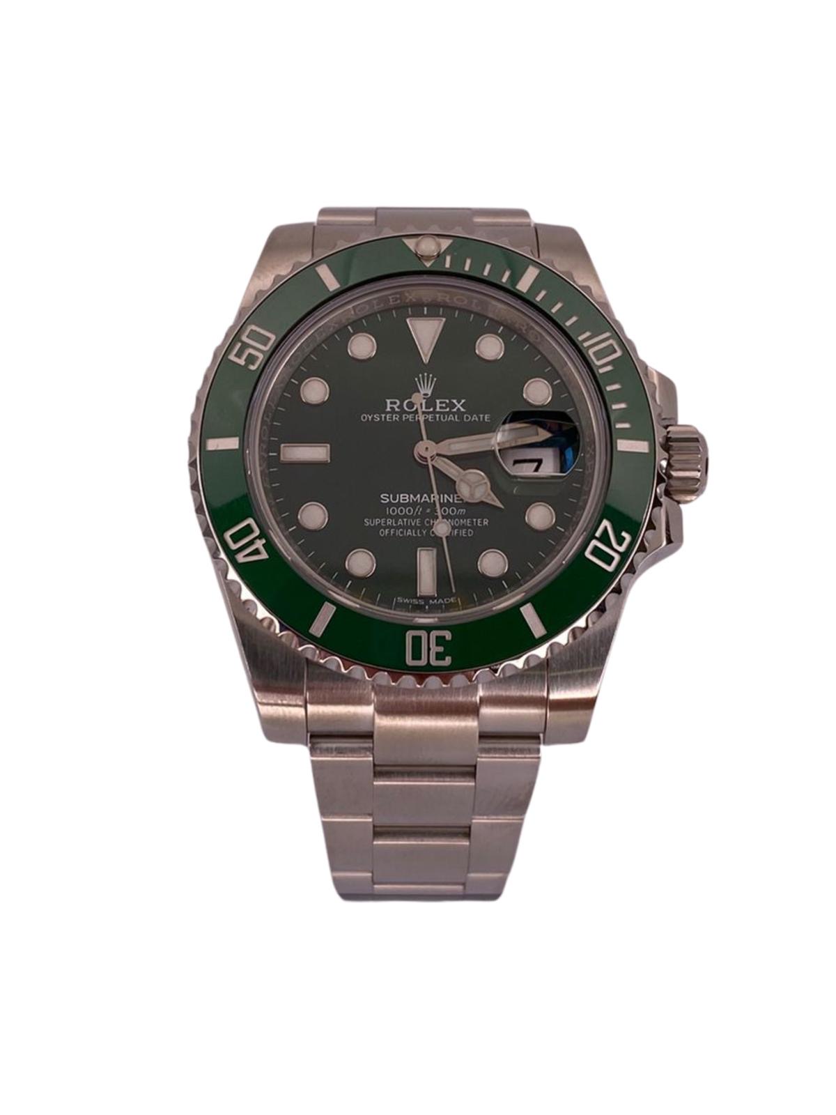 This Rolex Submariner 116610 LV has a green dial and a bracelet strap. This Rolex has undergone a thorough inspection of water resistance, accuracy, functionality and condition to determine the level of reconditioning required to meet our strict standards. It has also been referenced against technical documents and manufacturer records where available to ensure authenticity and a clean history. All our watches have a 24-month warranty for your peace of mind. One of our skilled polishing technicians has removed marks on the case and bracelet of this watch, brought about by daily wear and tear, which is why this watch does not come with the remaining manufacturer’s warranty.