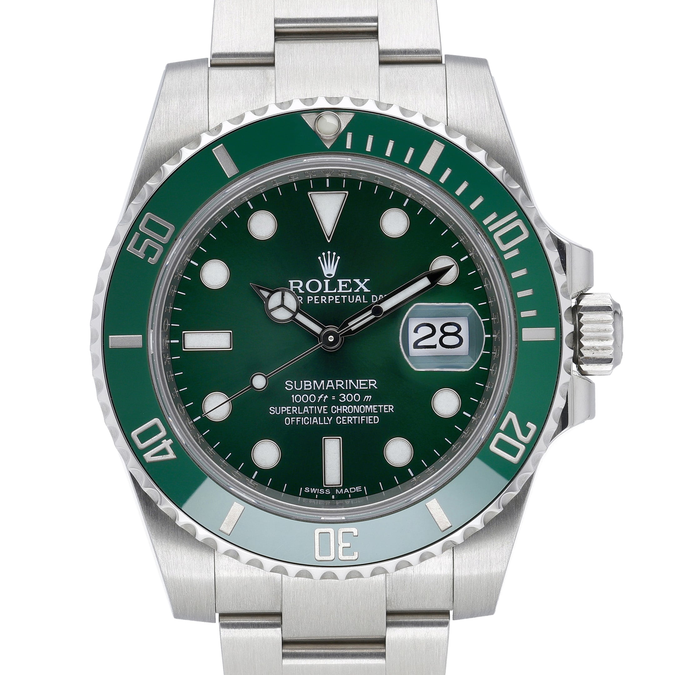 This Rolex Submariner 116610 LV has a green dial and a bracelet strap. This Rolex has undergone a thorough inspection of water resistance, accuracy, functionality and condition to determine the level of reconditioning required to meet our strict standards. It has also been referenced against technical documents and manufacturer records where available to ensure authenticity and a clean history. All our watches have a 24-month warranty for your peace of mind. One of our skilled polishing technicians has removed marks on the case and bracelet of this watch, brought about by daily wear and tear, which is why this watch does not come with the remaining manufacturer’s warranty.
