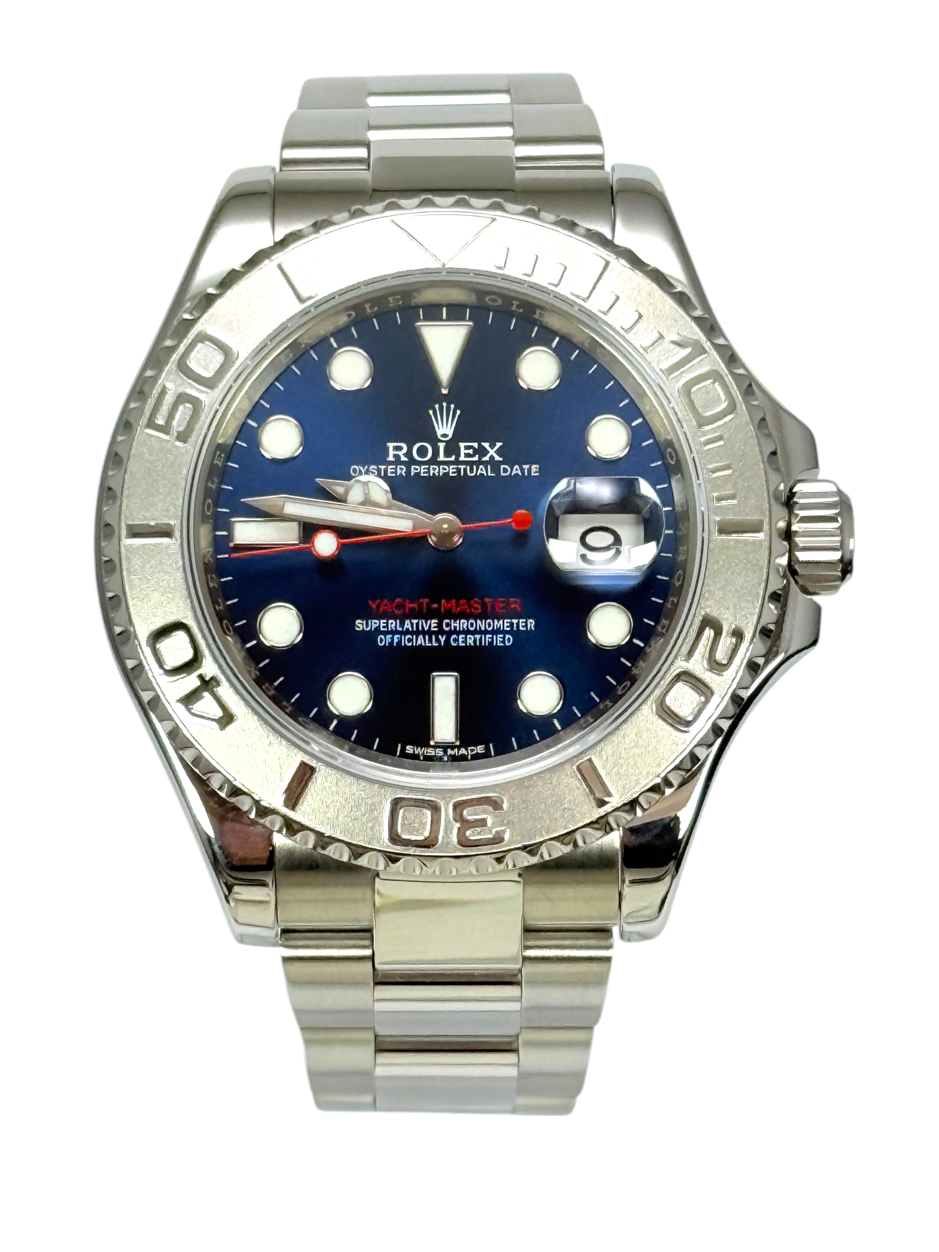 This Rolex Yacht-Master 116622 has a blue dial and a bracelet strap. This Rolex has undergone a thorough inspection of water resistance, accuracy, functionality and condition to determine the level of reconditioning required to meet our strict standards. It has also been referenced against technical documents and manufacturer records where available to ensure authenticity and a clean history. All our watches have a 24-month warranty for your peace of mind. One of our skilled polishing technicians has removed marks on the case and bracelet of this watch, brought about by daily wear and tear, which is why this watch does not come with the remaining manufacturer’s warranty.