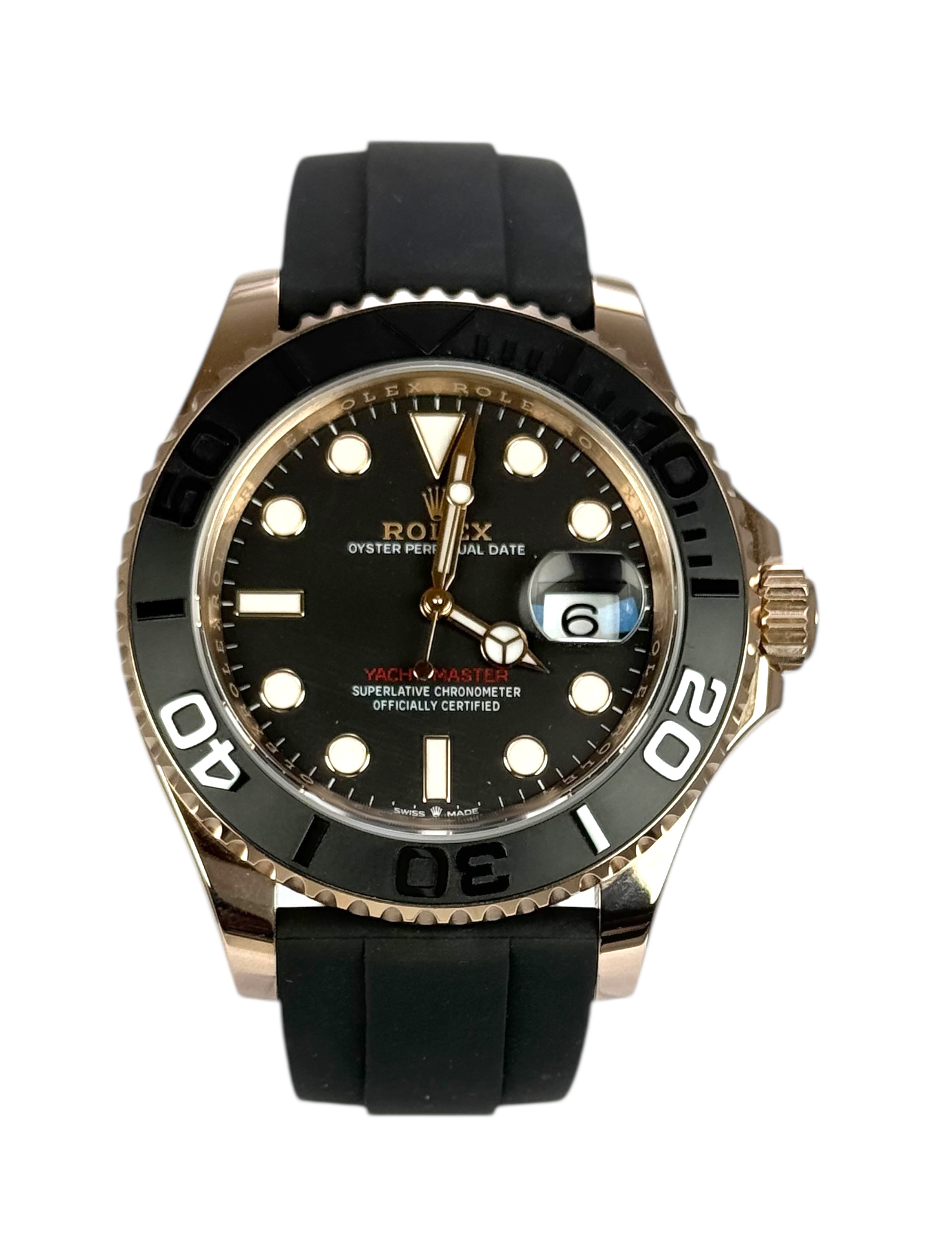 This Rolex Yacht-Master 126655 has a black dial and a rubber strap. This Rolex has undergone a thorough inspection of water resistance, accuracy, functionality and condition to determine the level of reconditioning required to meet our strict standards. It has also been referenced against technical documents and manufacturer records where available to ensure authenticity and a clean history. Our watches have a 24-month warranty for your peace of mind, in conjunction with any remaining manufacturer’s warranty from new or from service. To maintain the manufacturer’s warranty on this watch, it has not been polished in our service centre.