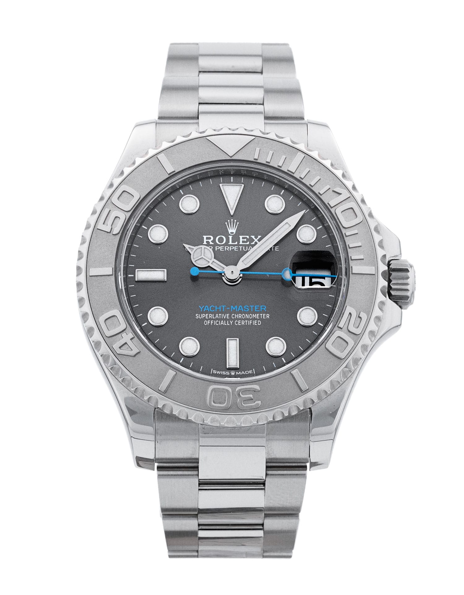 This Rolex Yacht-Master 268622 has a slate dial and a bracelet strap. This Rolex has undergone a thorough inspection of water resistance, accuracy, functionality and condition to determine the level of reconditioning required to meet our strict standards. It has also been referenced against technical documents and manufacturer records where available to ensure authenticity and a clean history. All our watches have a 24-month warranty for your peace of mind. One of our skilled polishing technicians has removed marks on the case and bracelet of this watch, brought about by daily wear and tear, which is why this watch does not come with the remaining manufacturer’s warranty.