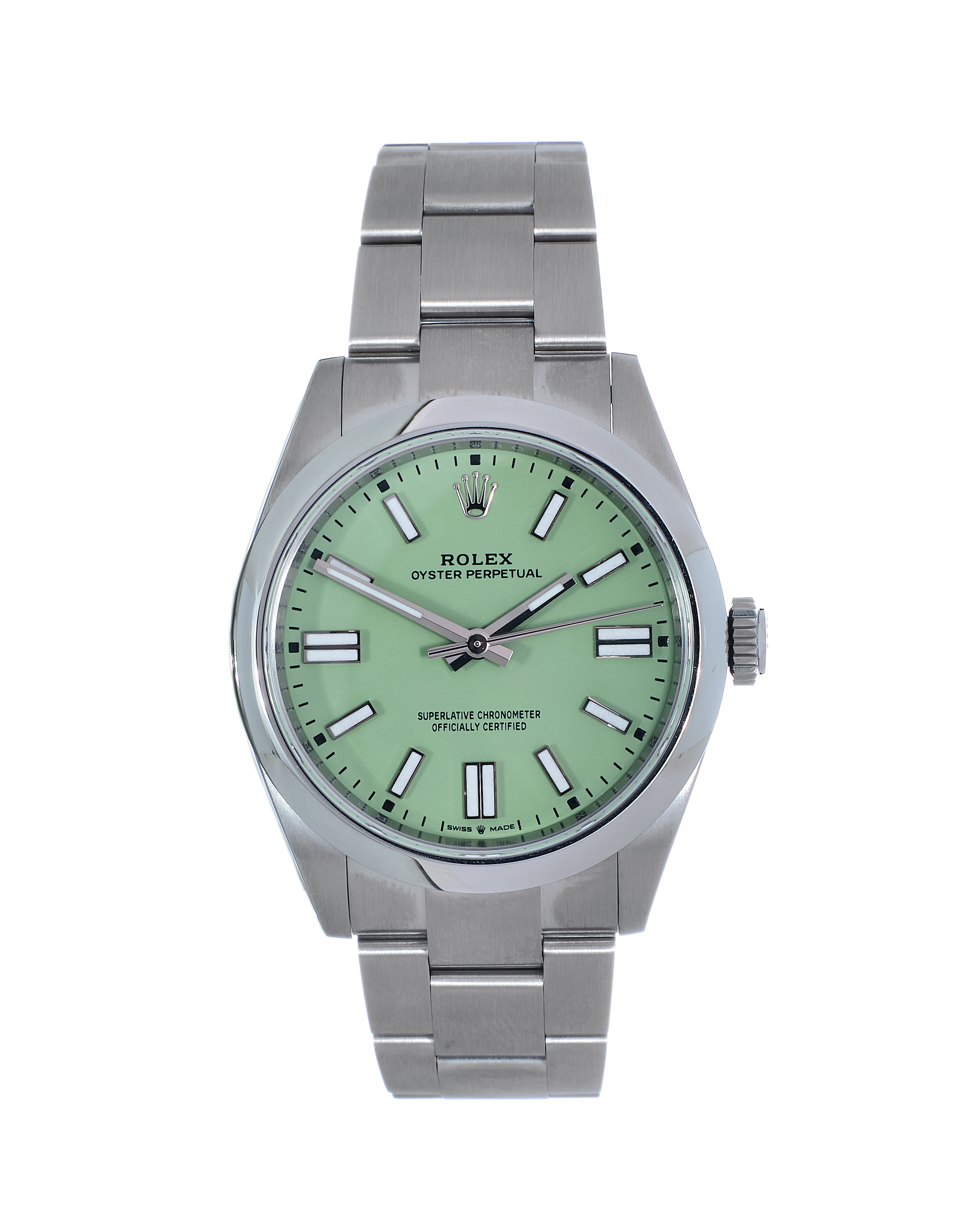 This Rolex Oyster Perpetual 41 134300 has a pistachio dial and a bracelet strap. This Rolex has undergone a thorough inspection of water resistance, accuracy, functionality and condition to determine the level of reconditioning required to meet our strict standards. It has also been referenced against technical documents and manufacturer records where available to ensure authenticity and a clean history. Our watches have a 24-month warranty for your peace of mind, in conjunction with any remaining manufacturer’s warranty from new or from service. To maintain the manufacturer’s warranty on this watch, it has not been polished in our service centre.