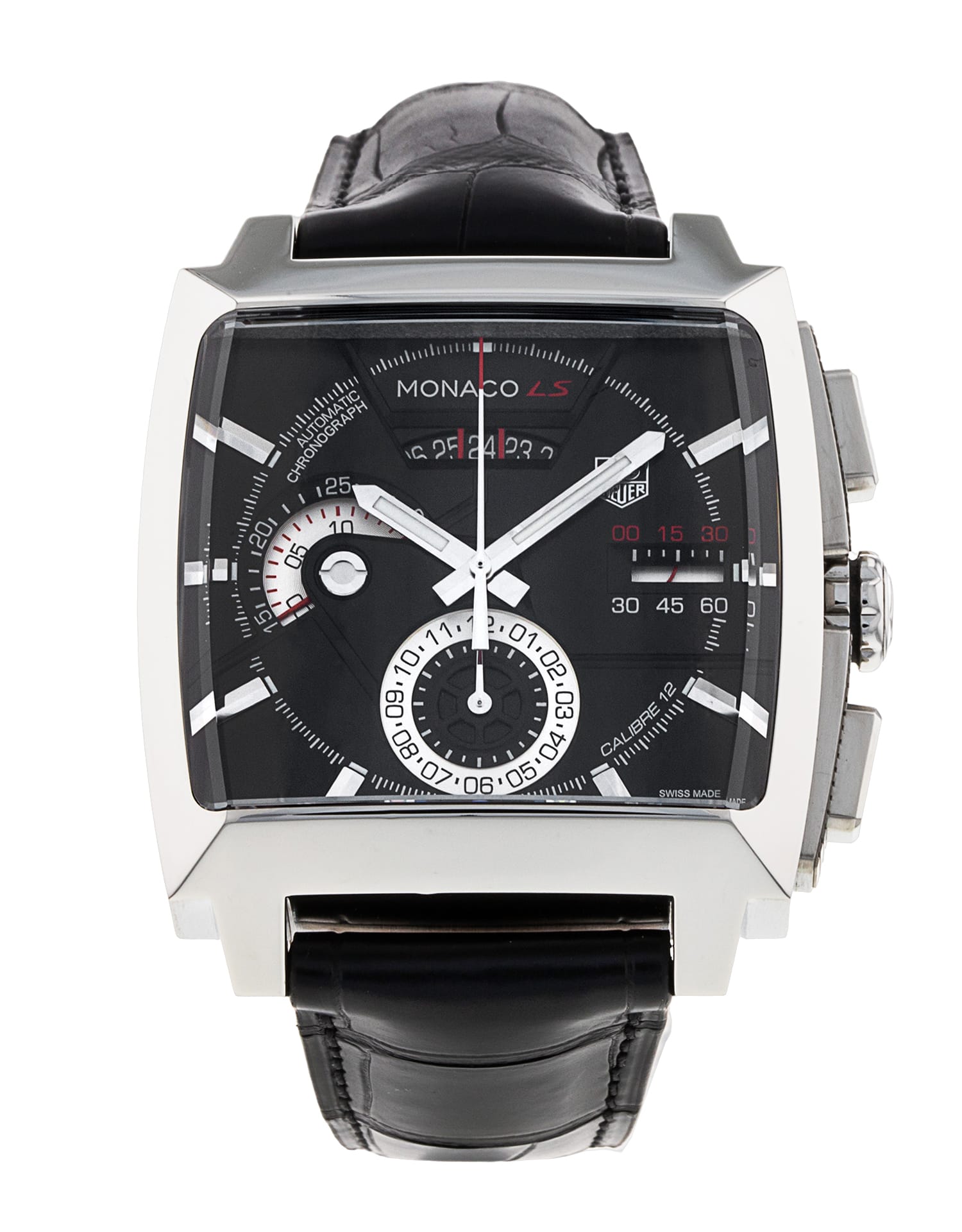 TAG Heuer's Calibre 12 LS automatic chronograph is remarkable for many reasons. The most immediately striking is the gorgeous racing watch design based on the iconic shape of the Monaco, one of the best loved drivers' watches in the world. But the Calibre 12 is not just a pretty red, white and black face. It has also developed an innovative and stunning new way of showing the time: the LS “linear system”, which gives many of the subdials a resemblance to classic dashboard indicators. At the top is the date window, where a whole section of the wheel is purposely visible. Then there's the unique retrograde seconds at 3 o'clock, which uses different coloured “hands” to show half a minute in a line, one after another. Finally the two chronograph counters: hours at 6 o'clock is comparatively conventional, while the 30 minute counter at 9 o'clock is a speedometer; like the seconds, two hands count 15 minutes each. The effect is breathtaking.