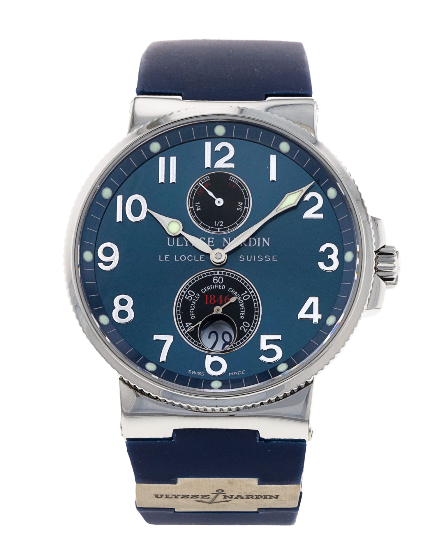 This Ulysse Nardin Marine 263-66-3/623 has a blue arabic dial and a rubber strap. This Ulysse Nardin has undergone a thorough inspection of water resistance, accuracy, functionality and condition to determine the level of reconditioning required to meet our strict standards. It has also been referenced against technical documents and manufacturer records where available to ensure authenticity and a clean history. All our watches have a 24-month warranty for your peace of mind.
